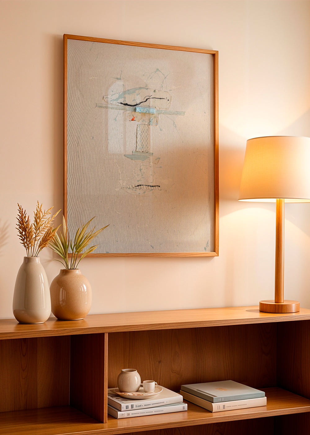 Per evitare rotture, le nostre cornici incorporano vetro acrilico al posto del vetro. Il vetro acrilico riproduce l'effetto del vetro, ma evita possibili danni durante il trasporto o il posizionamento della cornice.