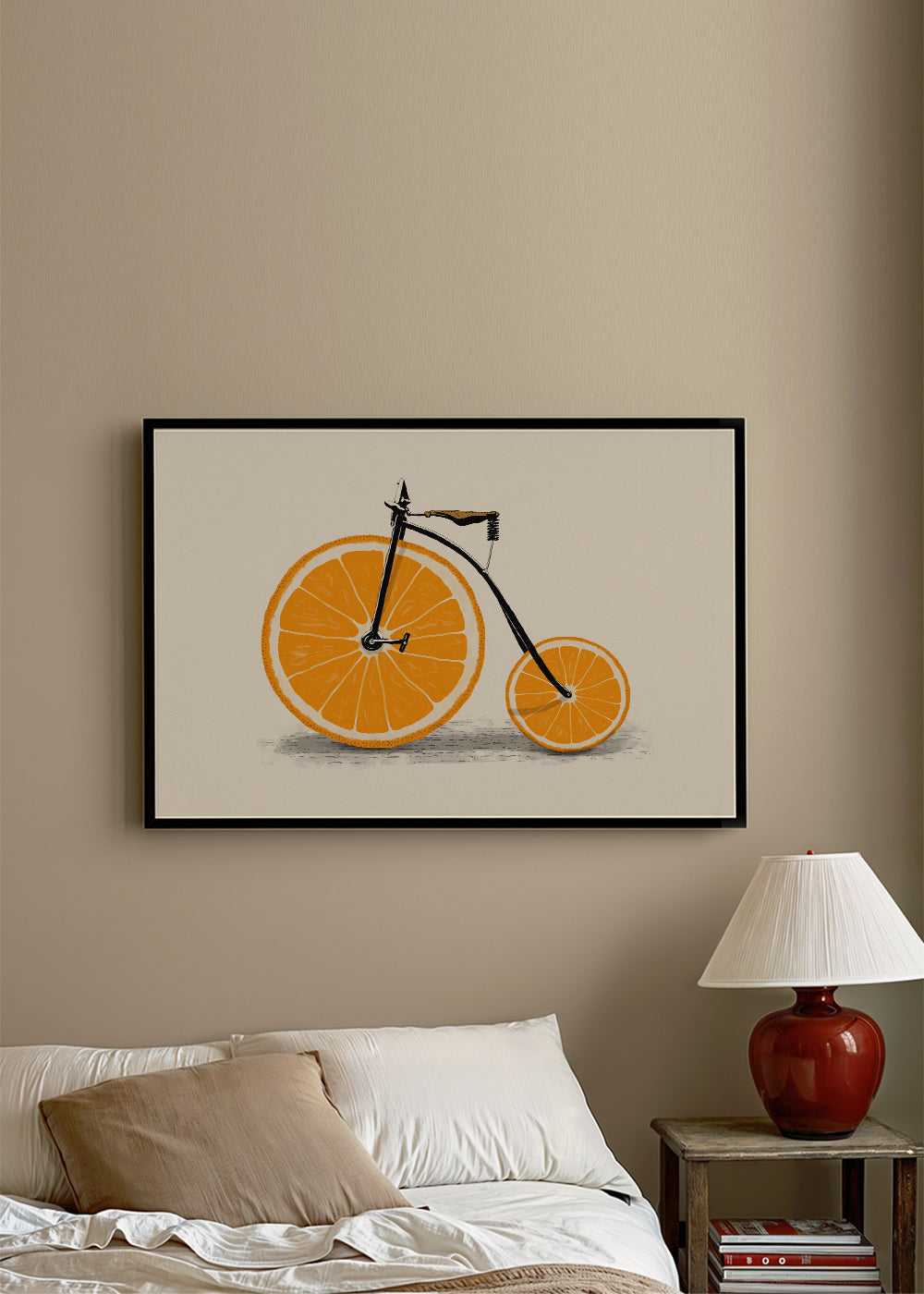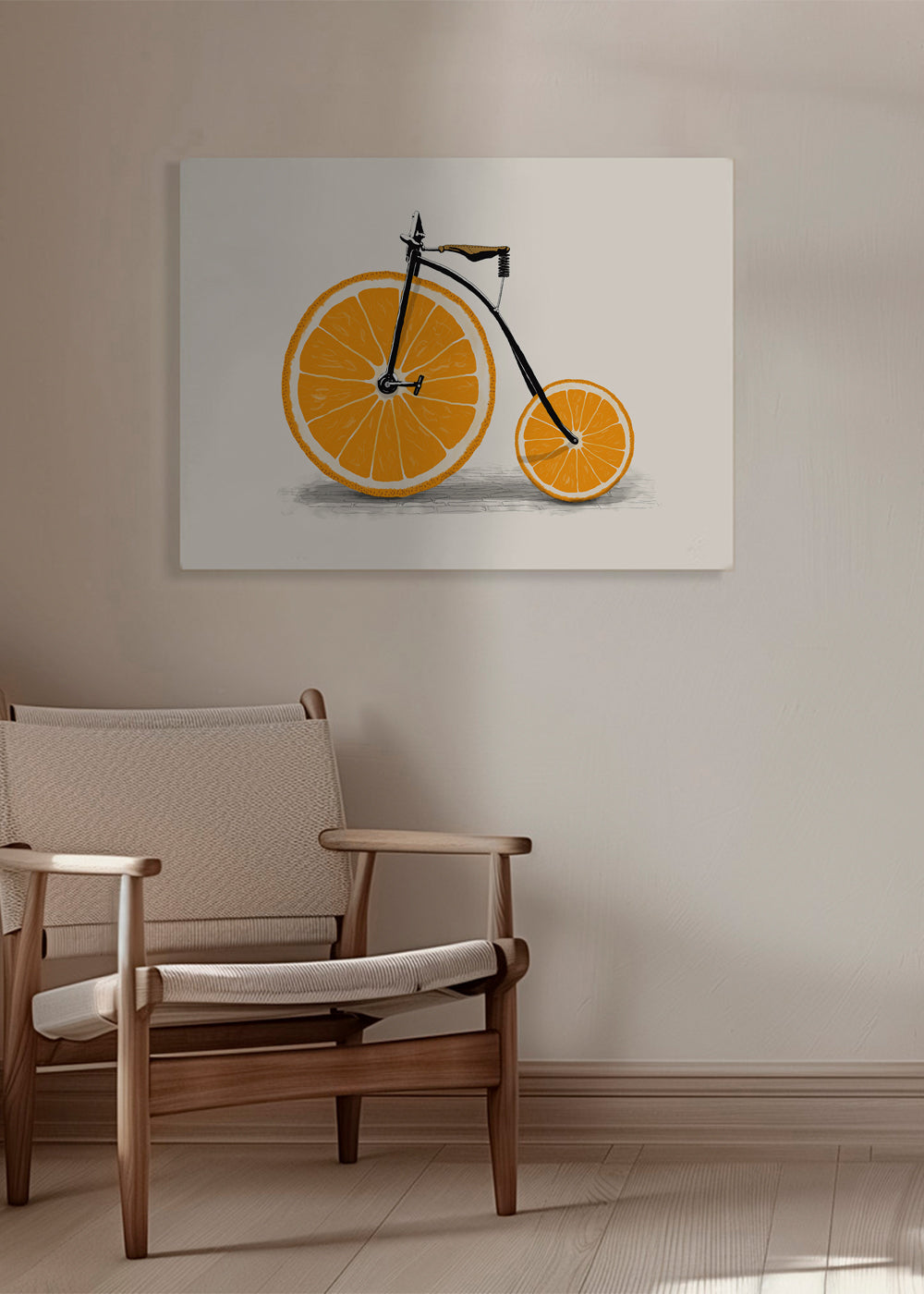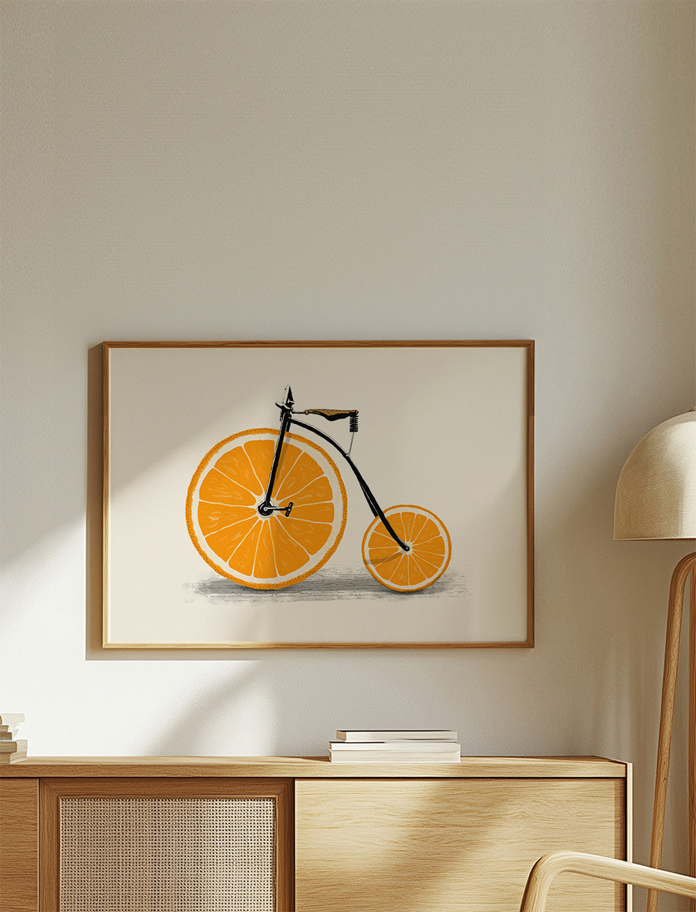 Una stampa ispirato alla collezione di quadri con biciclette, realizzata da Florent Bodart, dalle sfumature arance, e nel formato orizzontale. Un'opera dallo stile retrò ideale per un home decor dai tocchi vintage. Decora la tua casa con un tocco artistico.