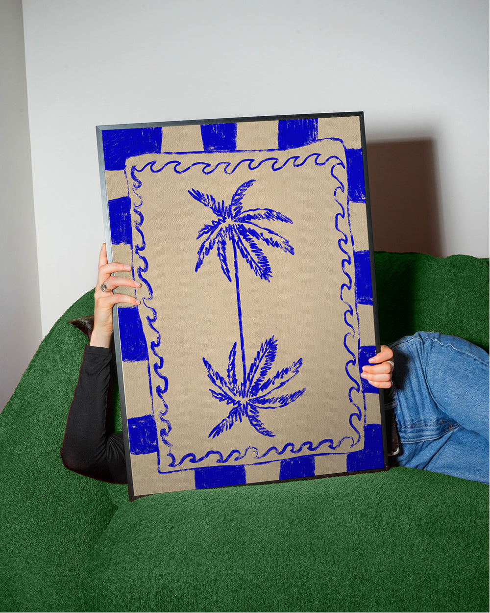 Una immagine della serie di quadri con palme, ideata da Shatha Dafai, con colori blu, e con disposizione verticale. Si tratta di un'illustrazione semplice e pulita, che puoi abbinare ad altre illustrazioni per realizzare una composizione artistica. Cambia l'aspetto di una stanza semplicemente aggiungendo dei quadri alle pareti.