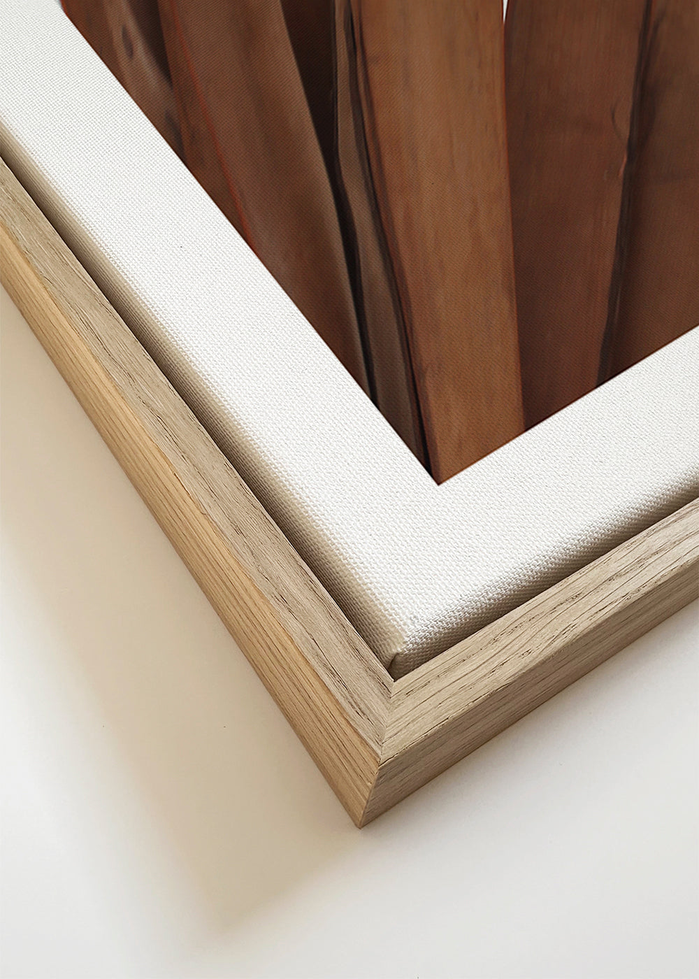 Le cornici in legno fino a 50x70 (compreso) hanno una larghezza di 1,5 cm e una profondità di 3 cm, mentre in quelle più grandi la larghezza è di 2 cm e una profondità di 3 cm.