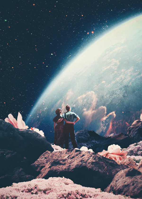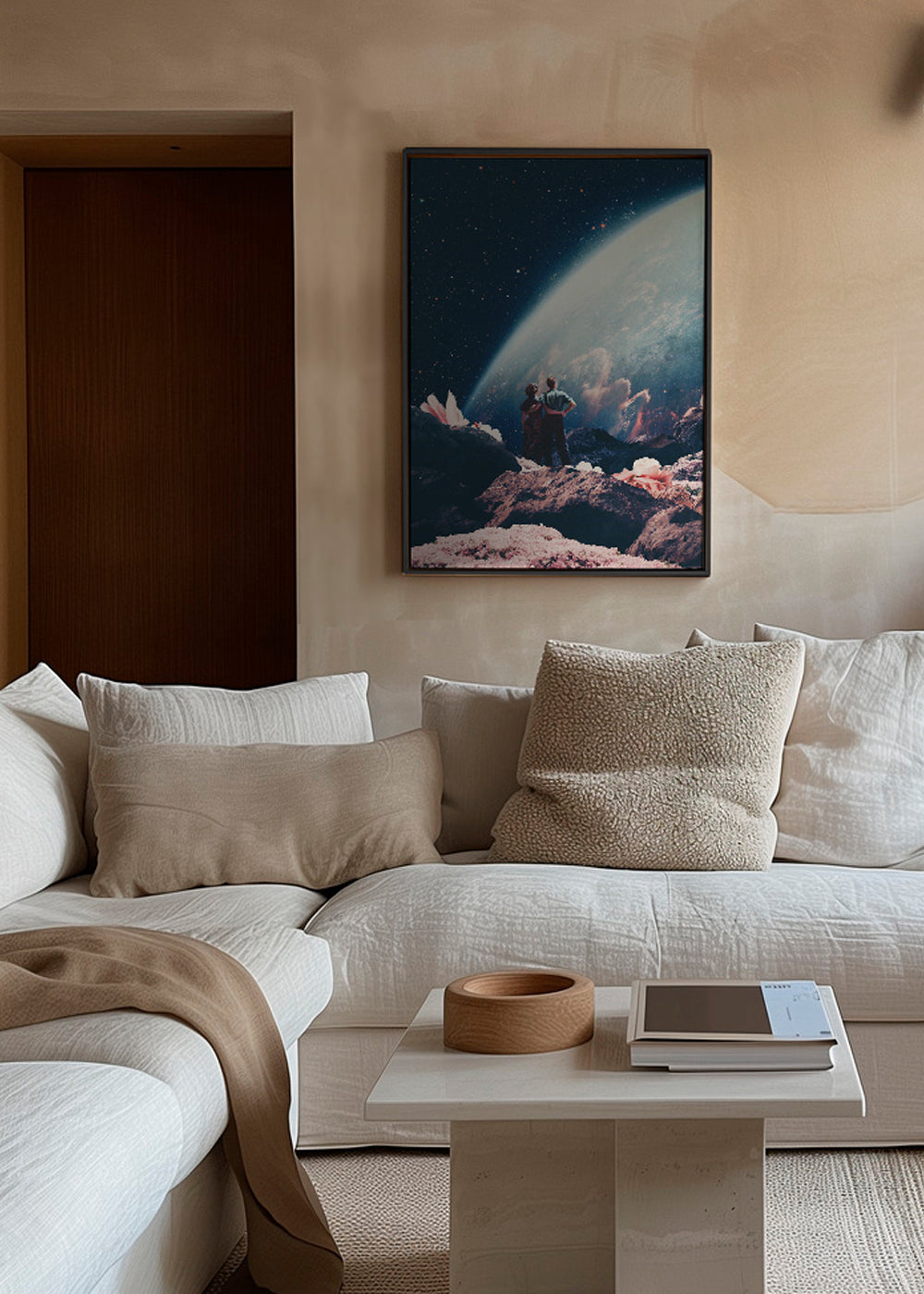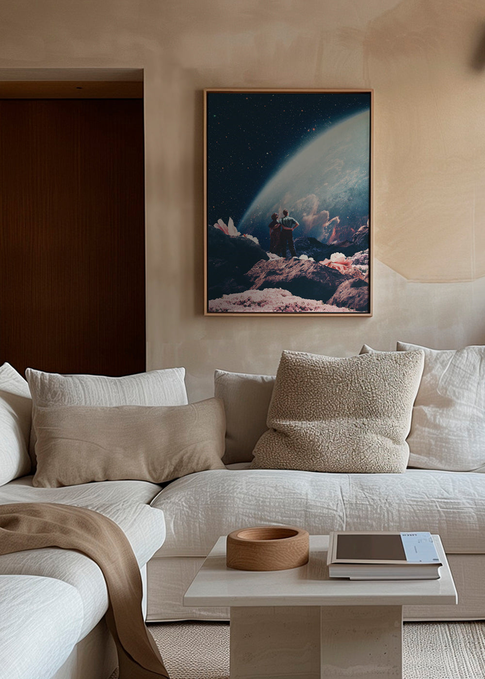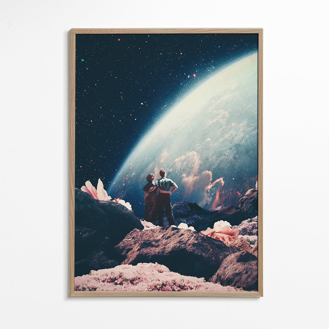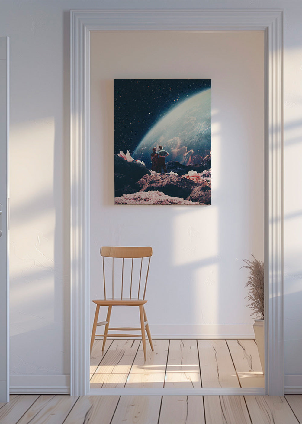 Bella stampa dal nostro repertorio di quadri con pianeti, della collezione dell'artista Frank Moth, con pigmenti blu, e da formato verticale. Un'opera dallo stile retrò ideale per un home decor dai tocchi vintage. Lascia che le tue pareti raccontino una storia.