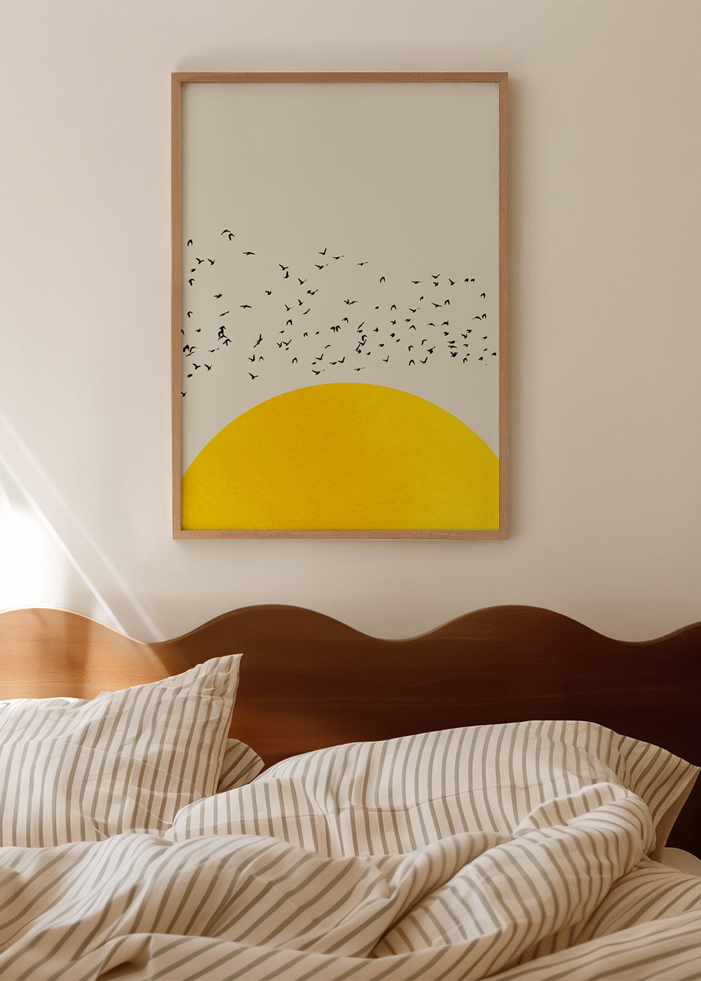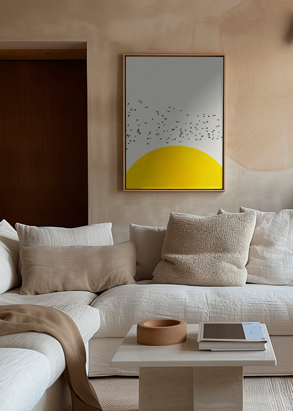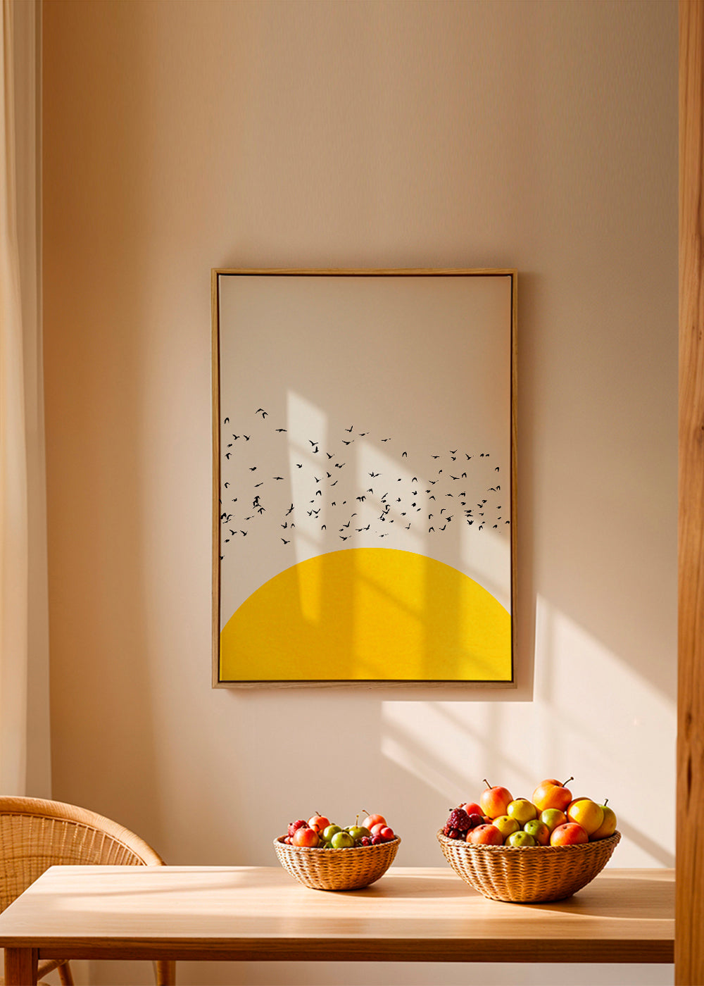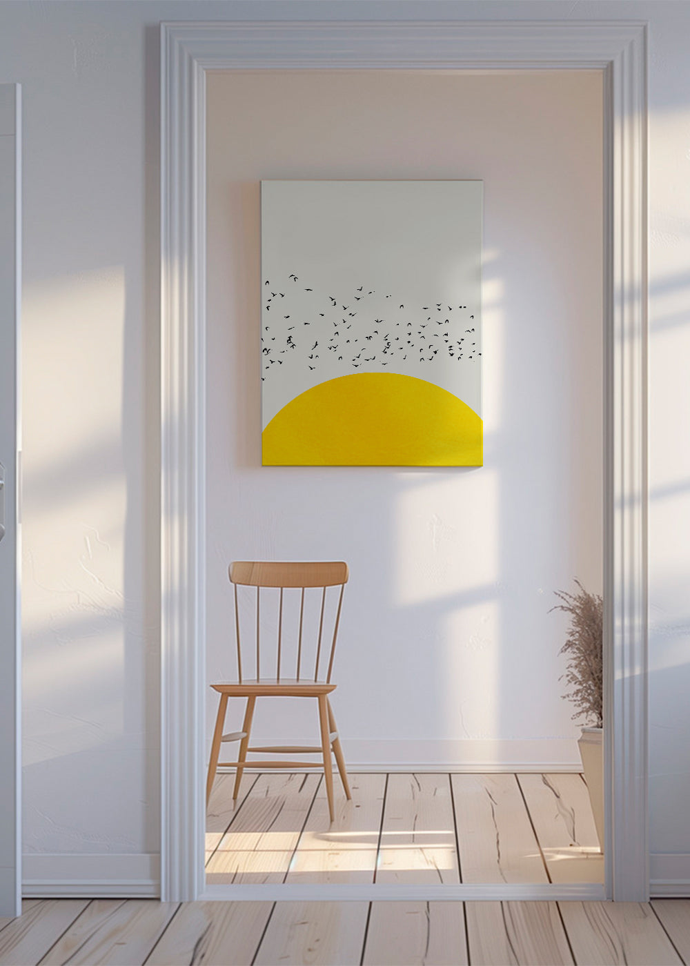 Una stampa della nostra collezione di quadri geometrici, di KUBISTIKA, sui toni gialli, e da formato verticale. Le forme geometriche e astratte contribuiscono a creare un ambiente spensierato e creativo. Pareti traboccanti di creatività.