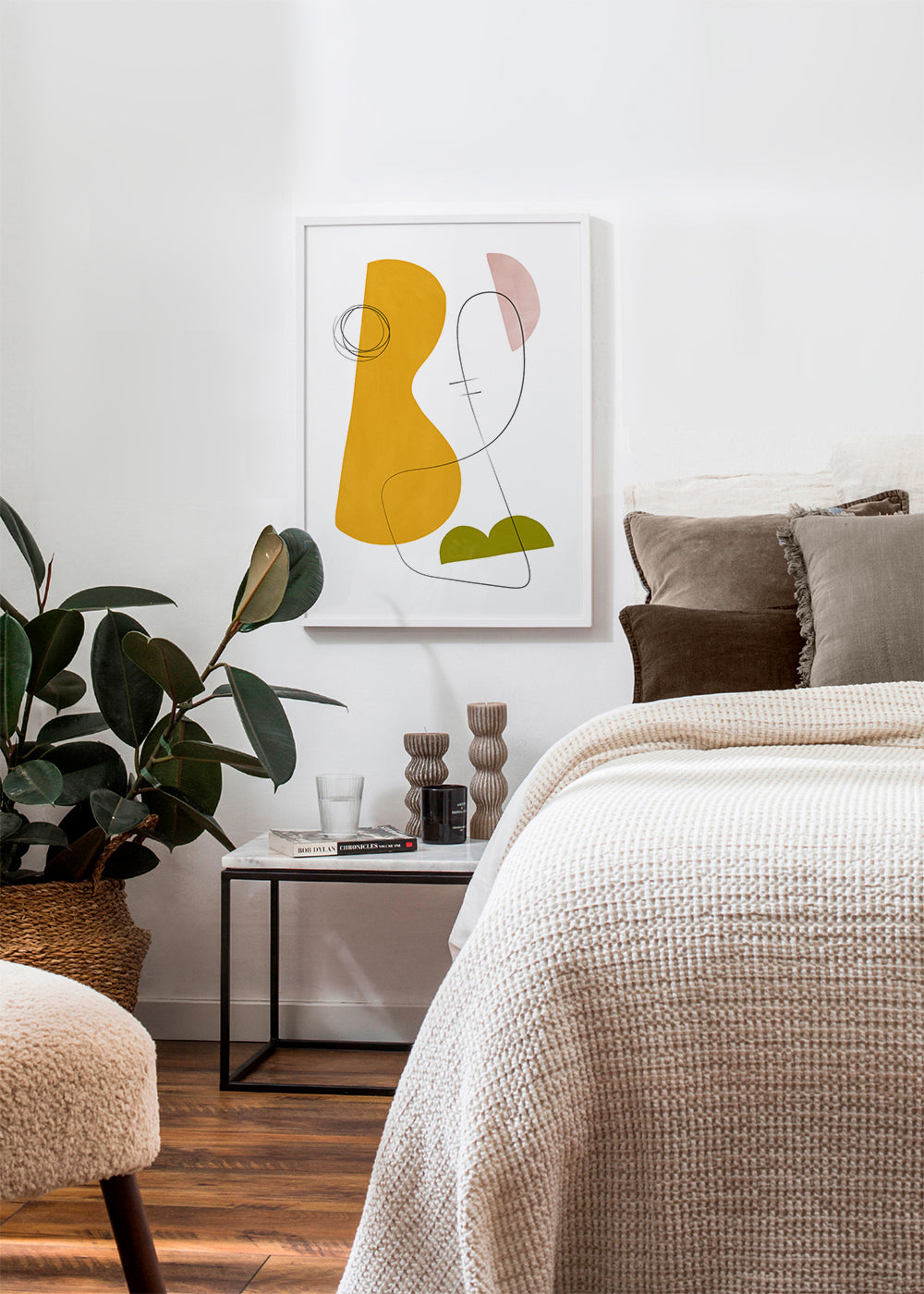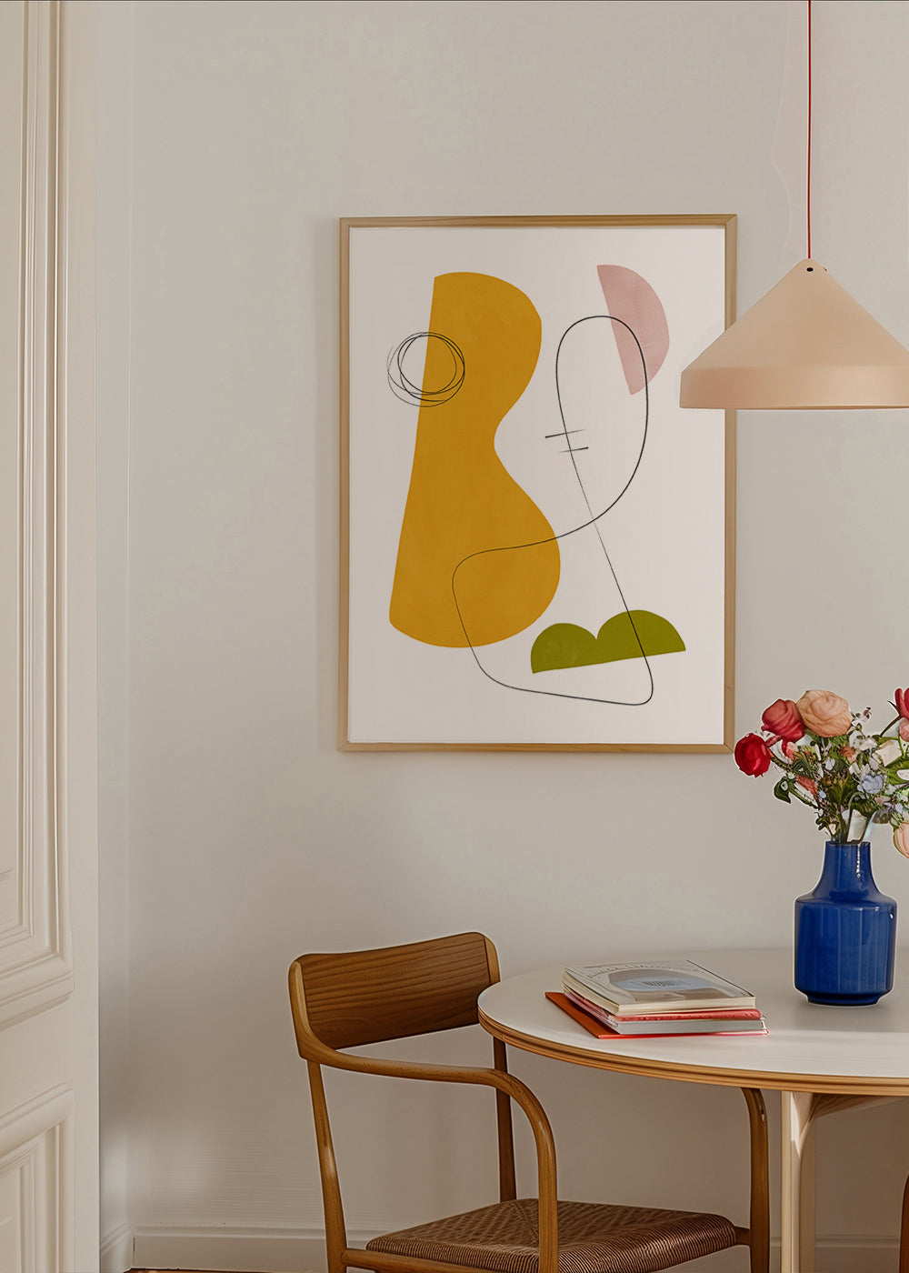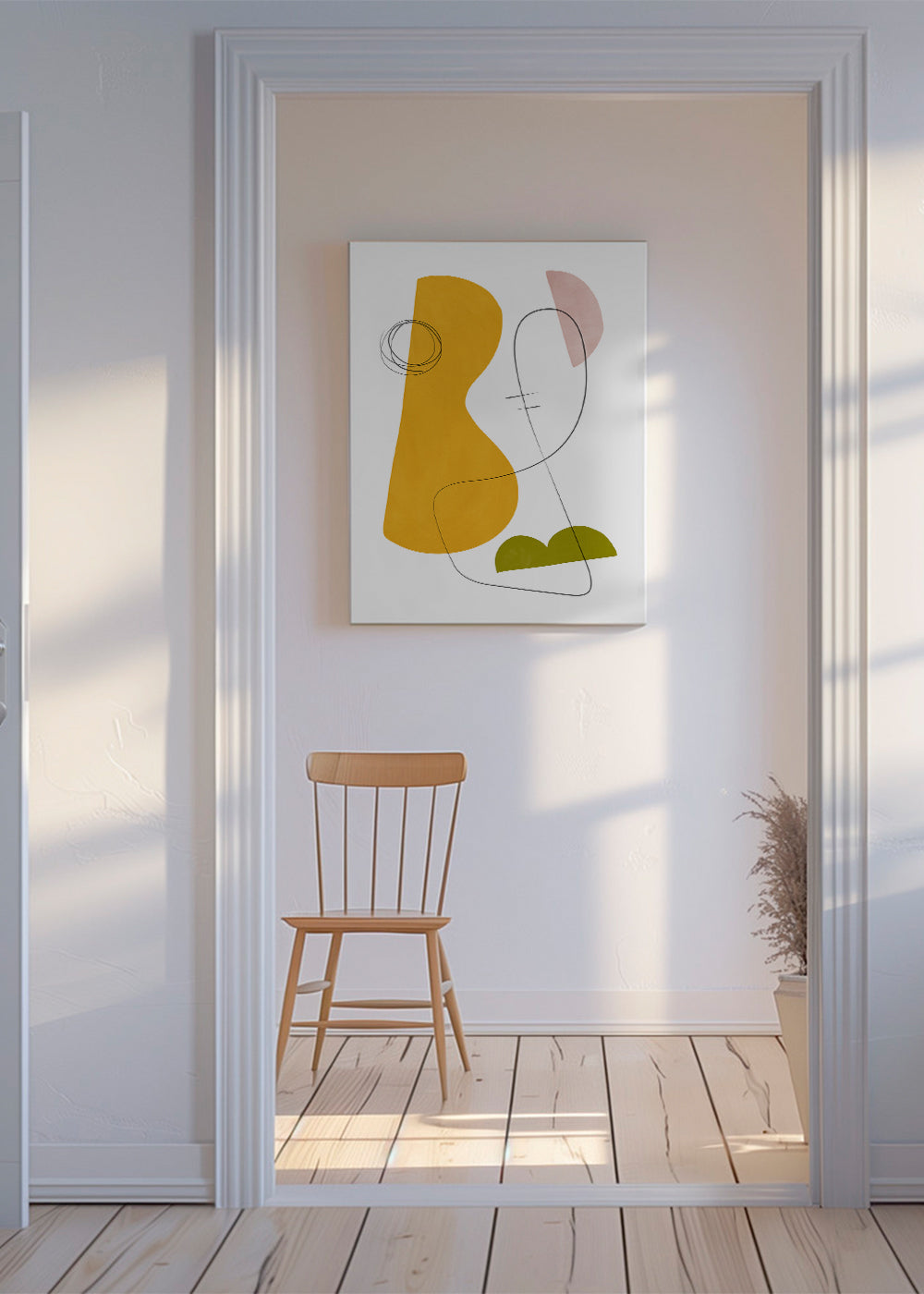 Un design ispirato alla collezione di quadri geometrici, della collezione dell'artista Nouveau Prints, con dei tocchi gialli, e orientata in senso verticale. Le forme geometriche e astratte contribuiscono a creare un ambiente spensierato e creativo. Cambia l'aspetto di una stanza semplicemente aggiungendo dei quadri alle pareti.