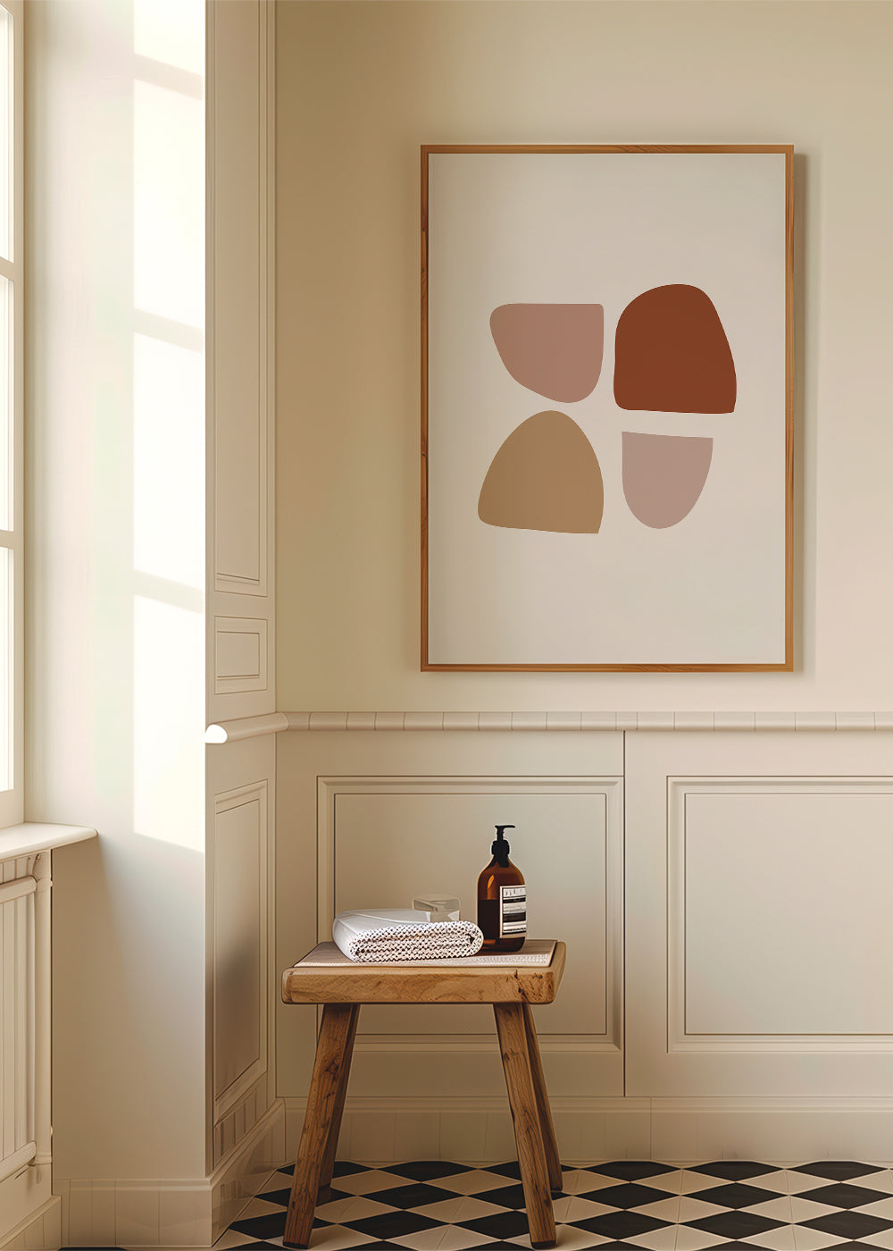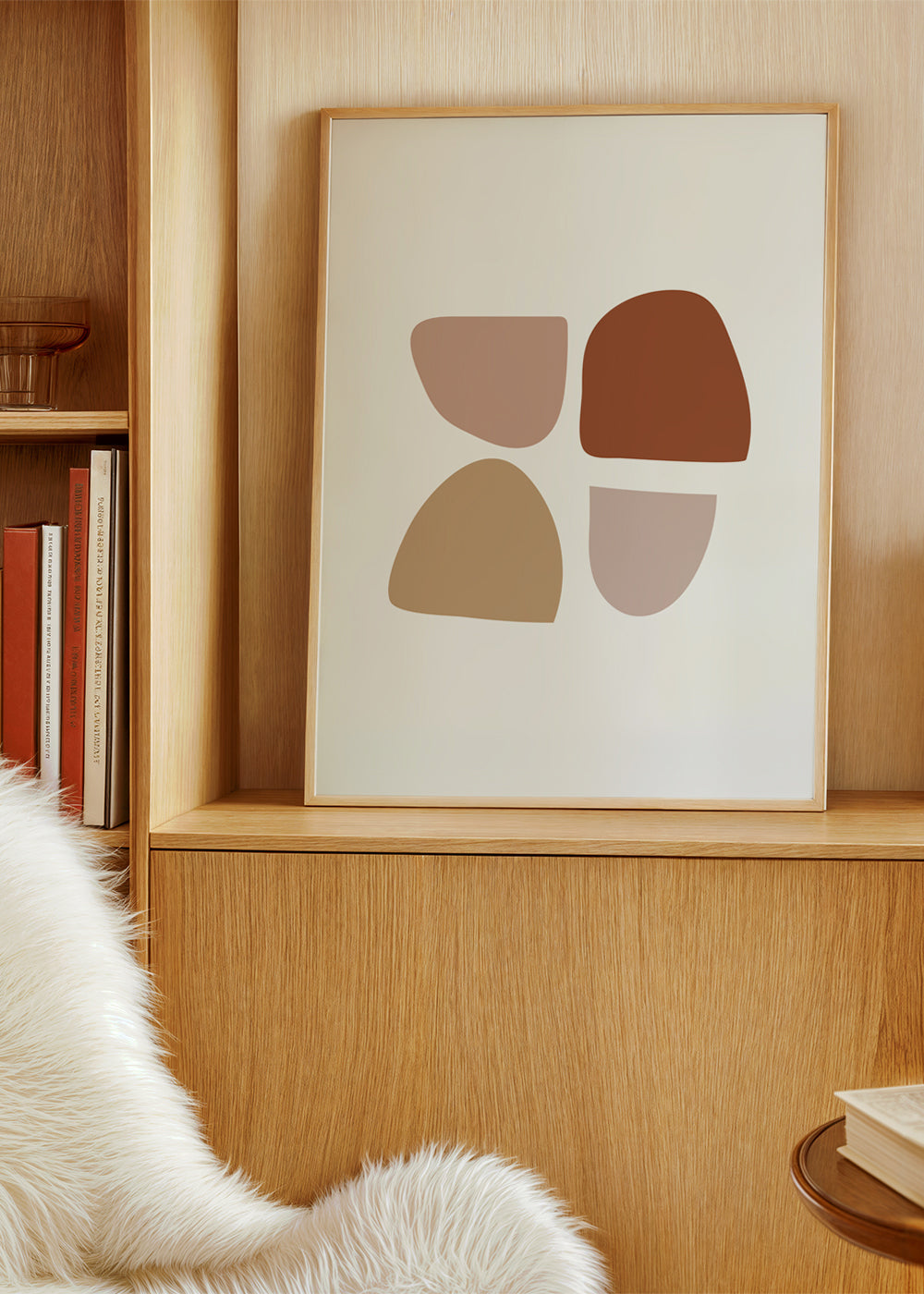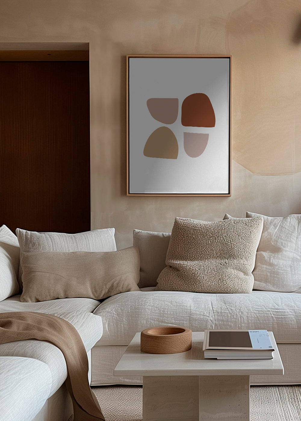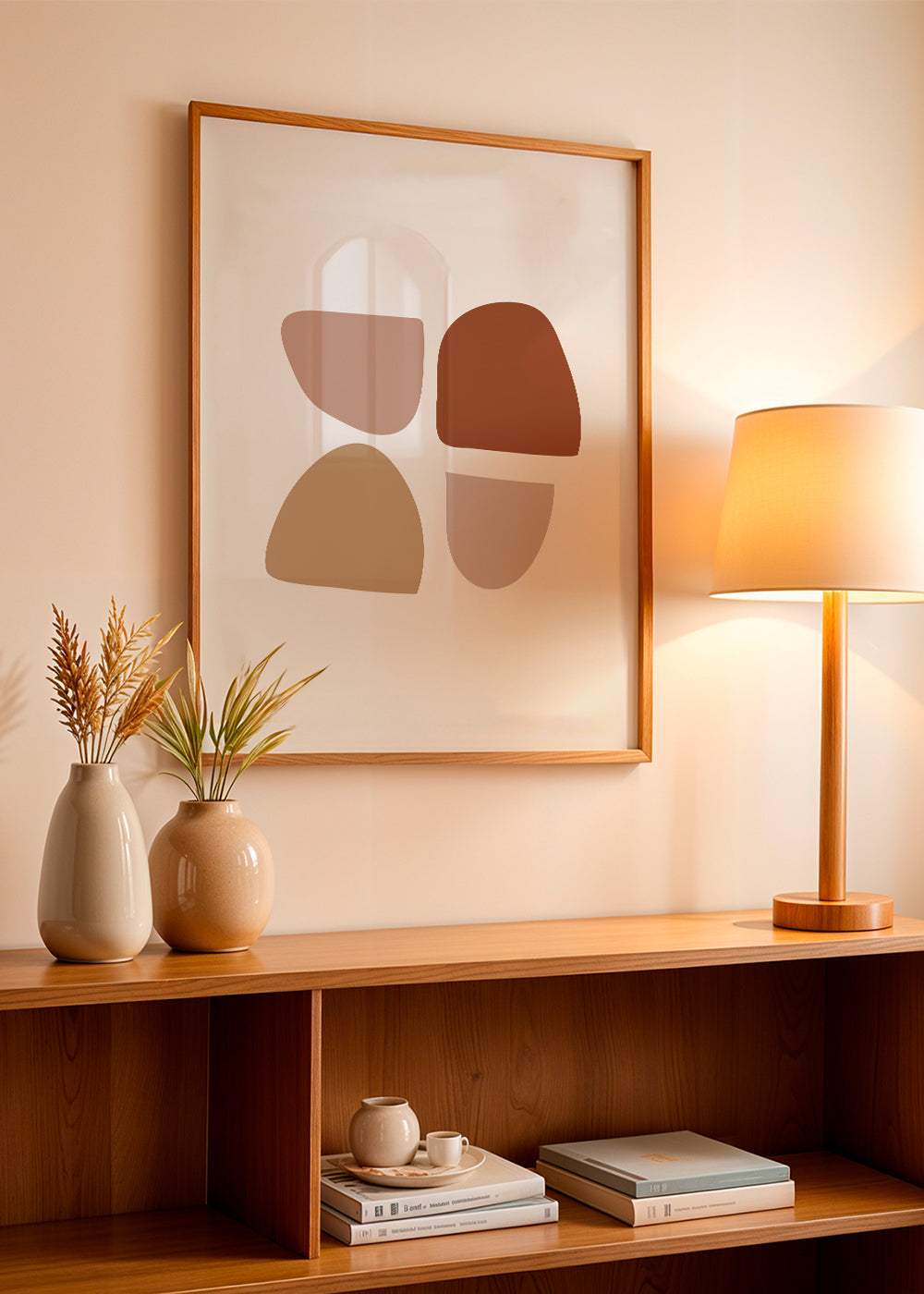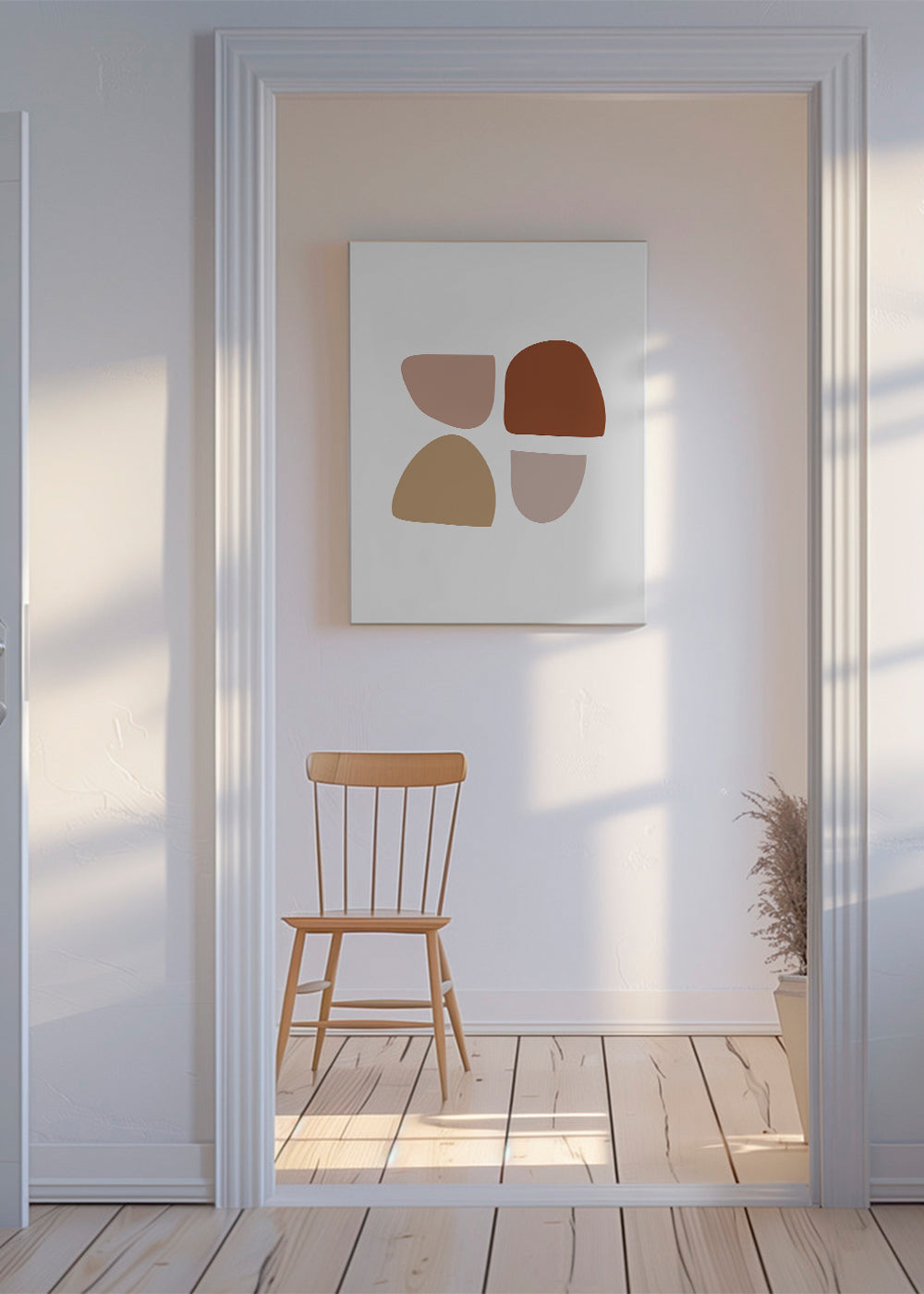 Una immagine della nostra collezione di quadri geometrici, originale di Studio Krone Kern, con sfumature dai colori marroni, e orientata in senso verticale. L'arte geometrica è uno stile raffinato per la decorazione delle pareti di casa. Una parete con dei quadri può trasformare completamente lo stile di una stanza.