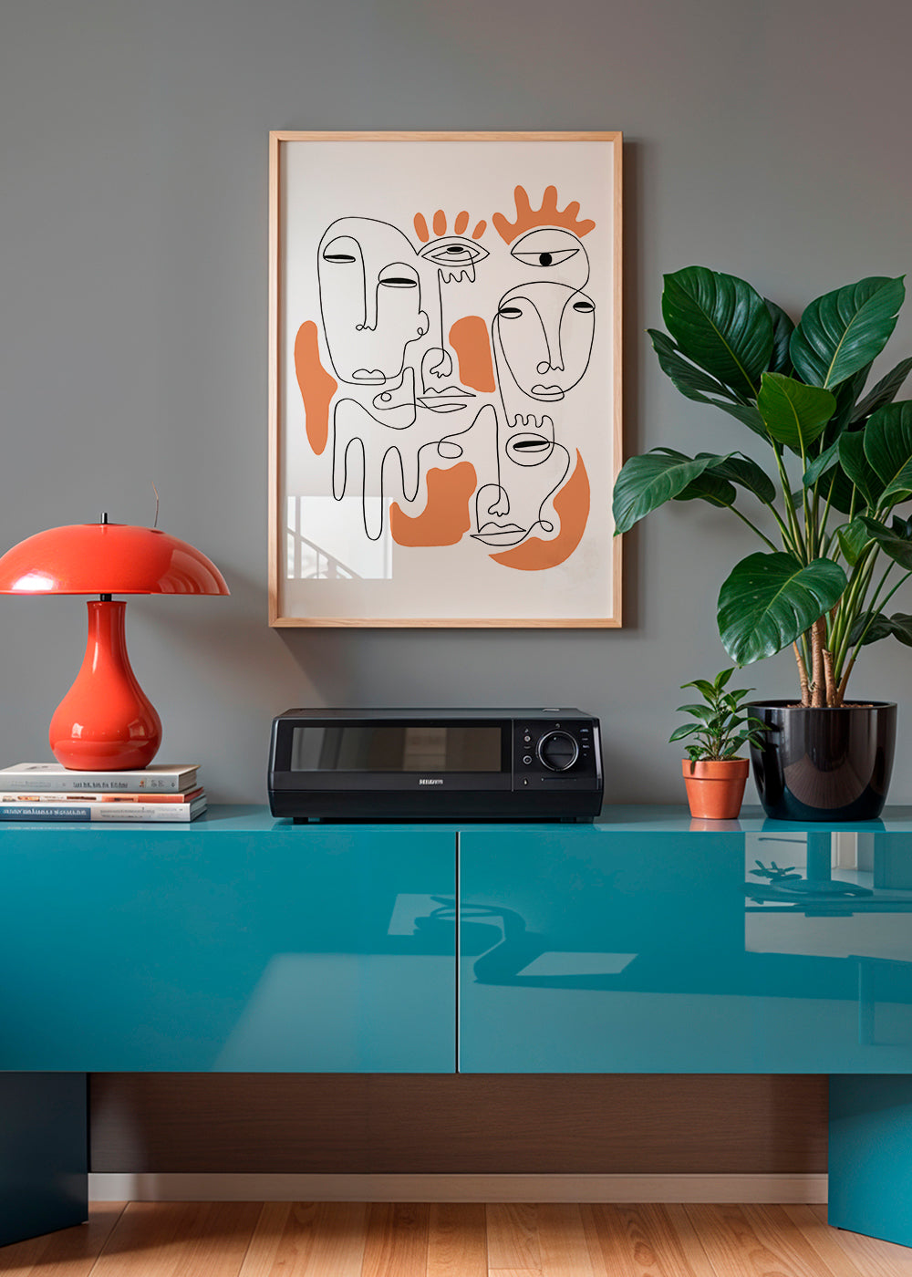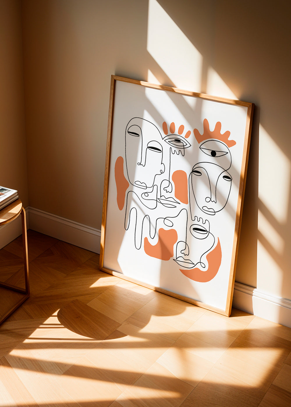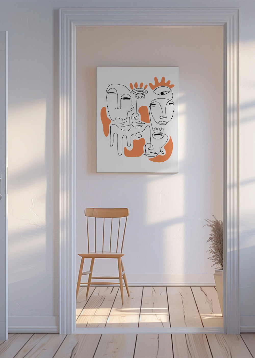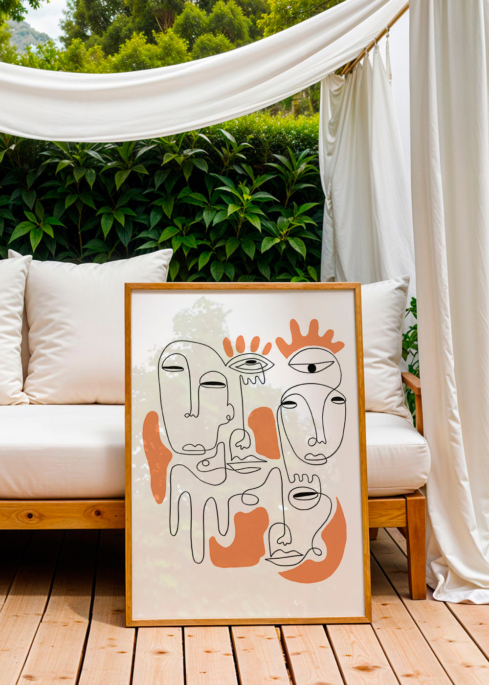 Bello quadro ispirato alla collezione di quadri con facce, creata da Shatha Dafai, sui toni arance, e con orientamento verticale. Decorare con quadri astratti è un'ottima scelta per chi desidera avere una casa dallo stile originale. Freschezza e originalità.