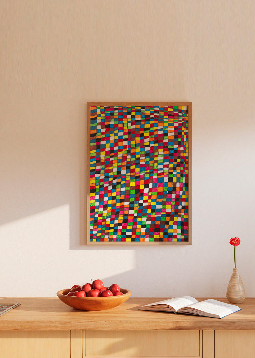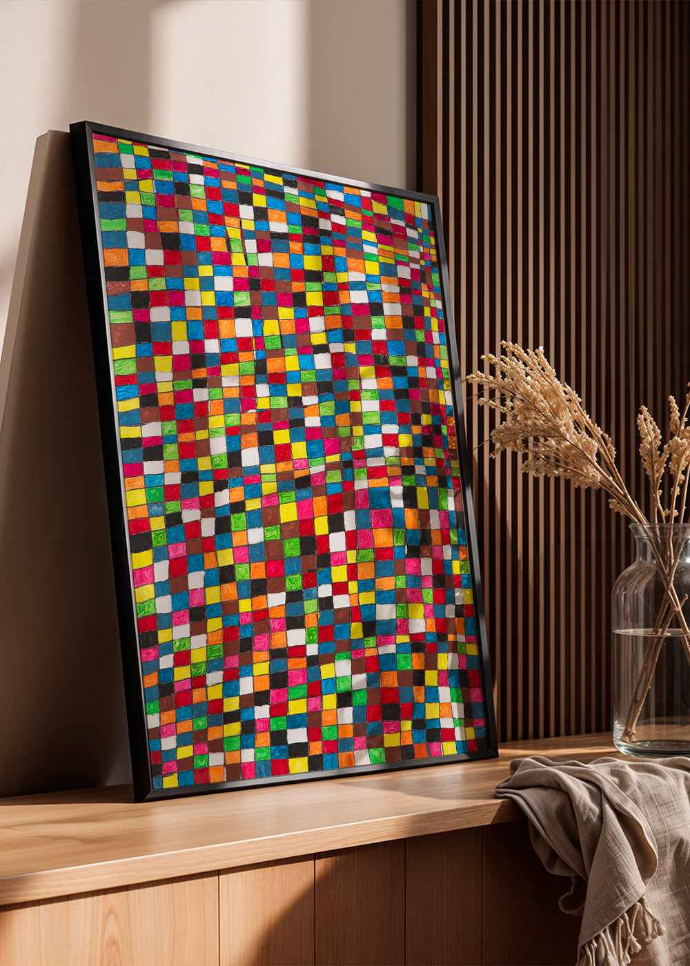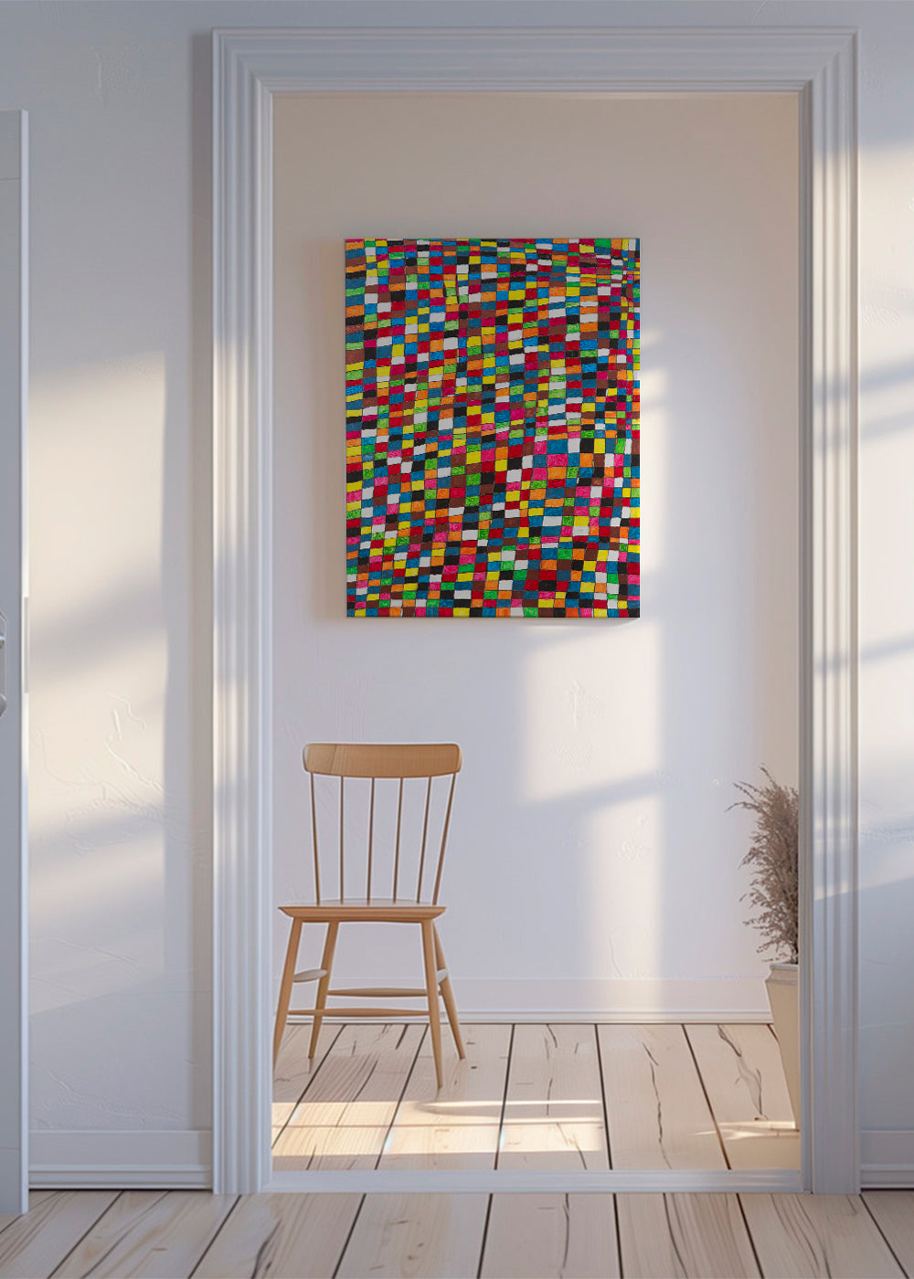 Un quadro nello stile dei nostri quadri geometrici, di Fundació Setba, con pigmenti multicolore, e ideale da mettere in posizione verticale. Le forme geometriche e astratte contribuiscono a creare un ambiente spensierato e creativo. Eleganza ispirata all'arte.