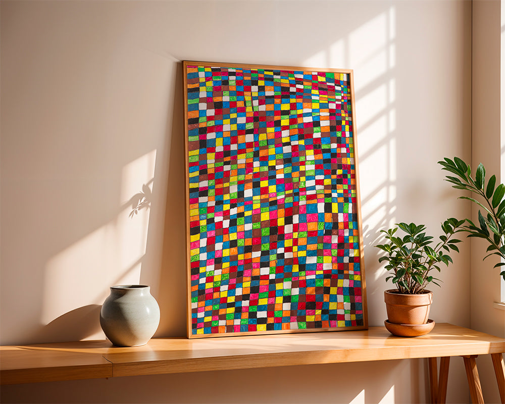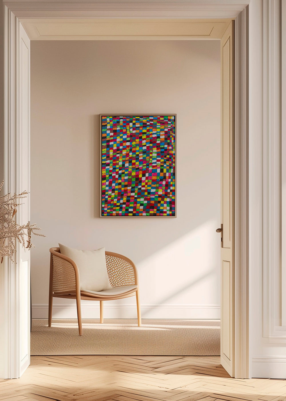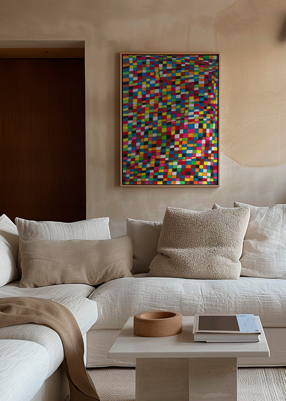 Un quadro nello stile dei nostri quadri geometrici, di Fundació Setba, con pigmenti multicolore, e ideale da mettere in posizione verticale. Le forme geometriche e astratte contribuiscono a creare un ambiente spensierato e creativo. Eleganza ispirata all'arte.