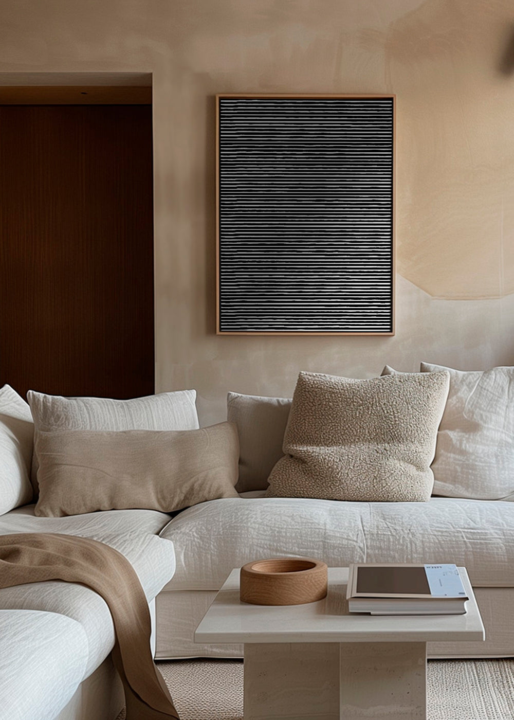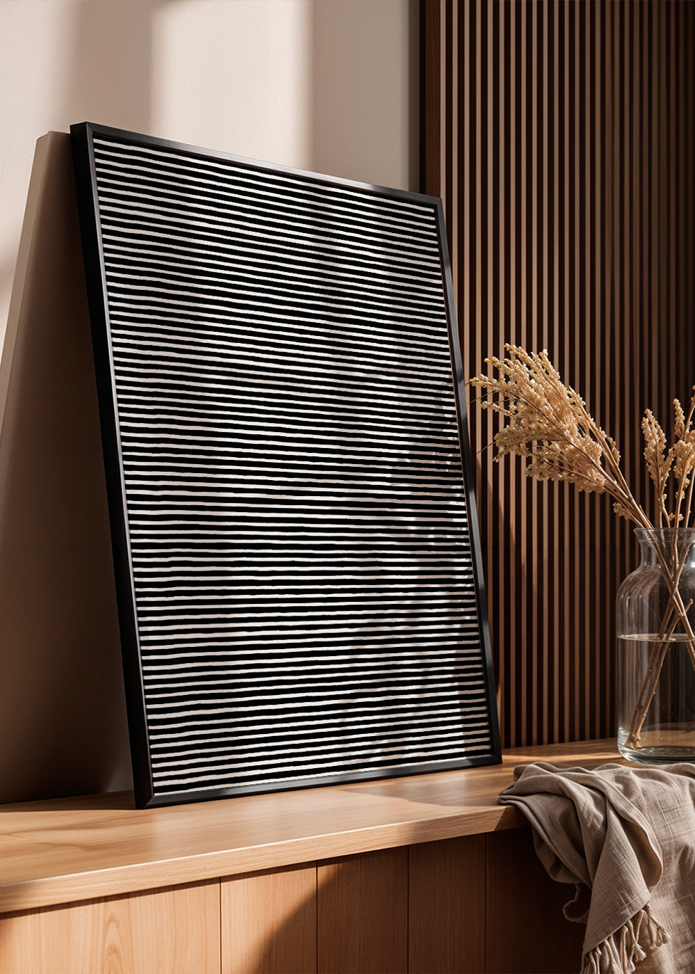 Bella pieza della collezione quadri con pattern, dell'artista Ninola Design, con dei tocchi monocromatico, e ideale da mettere in posizione verticale. Si tratta di un'quadro astratto ideale praticamente per qualunque ambiente della casa. Crea l'ambiente perfetto.