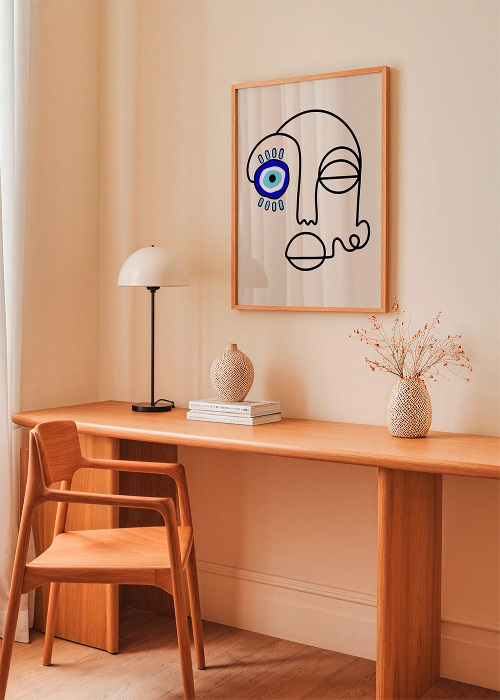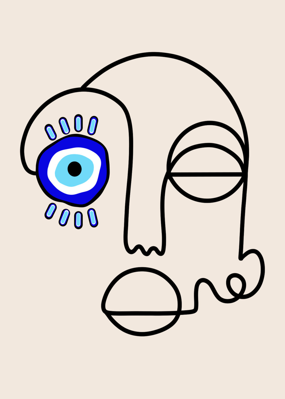 Una stampa ispirato alla collezione di quadri con facce, della collezione dell'artista Shatha Dafai, con dei tocchi blu, e da formato verticale. Le tele e stampe di arte astratta rimarcano l'originalità degli ambienti. Realizza un home decor ricco di arte.