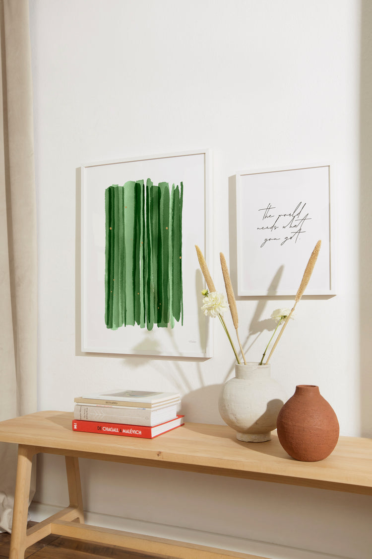 Una immagine appartenente alla categoria di quadri geometrici, creata da Fabiana Silveira, con sfumature dai colori verdi, e orientata in senso verticale. L'arte geometrica è uno stile raffinato per la decorazione delle pareti di casa. Lo stile della tua casa è nelle tue mani.