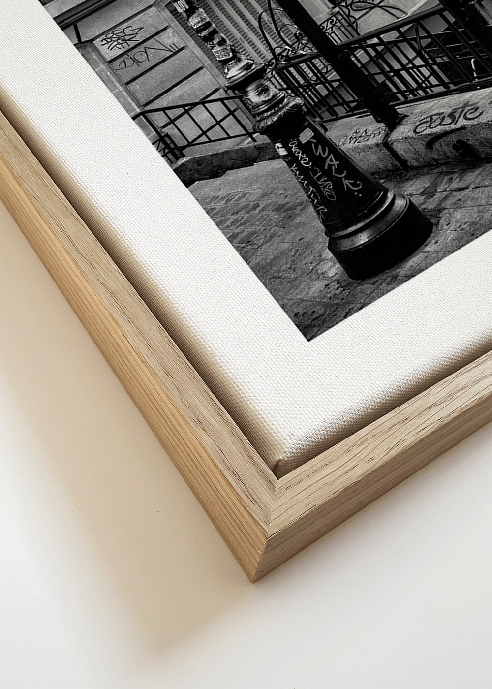 Per evitare rotture, le nostre cornici incorporano vetro acrilico al posto del vetro. Il vetro acrilico riproduce l'effetto del vetro, ma evita possibili danni durante il trasporto o il posizionamento della cornice.