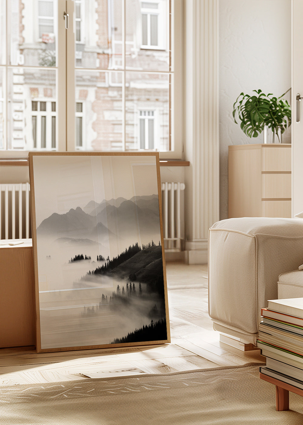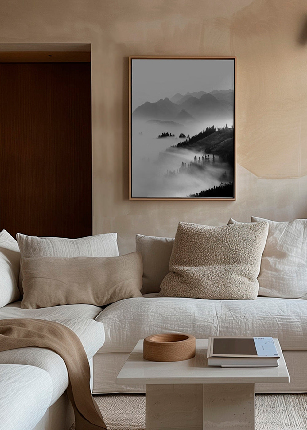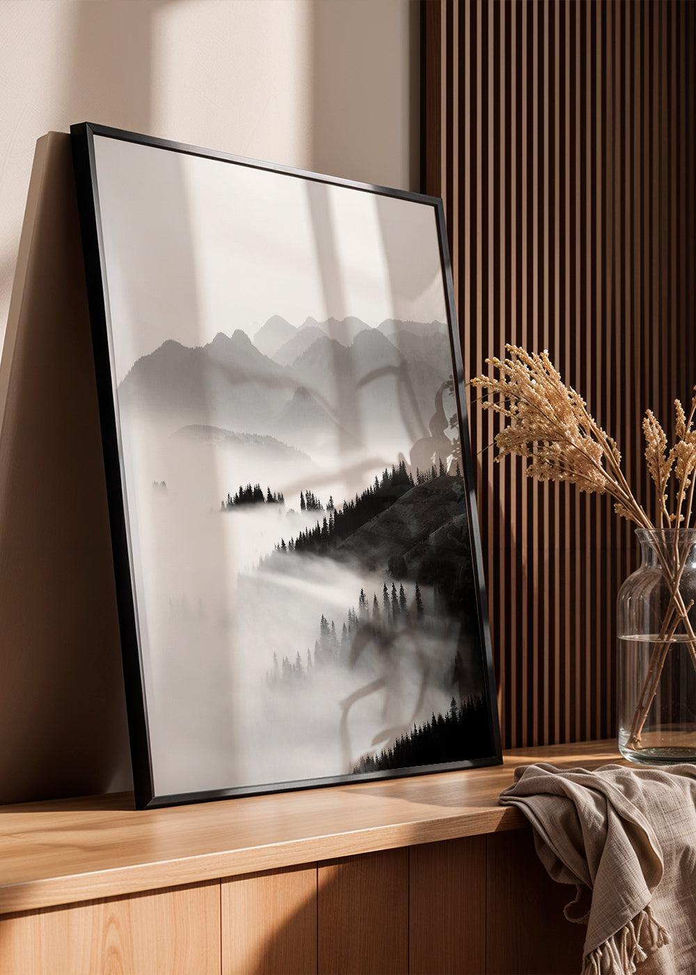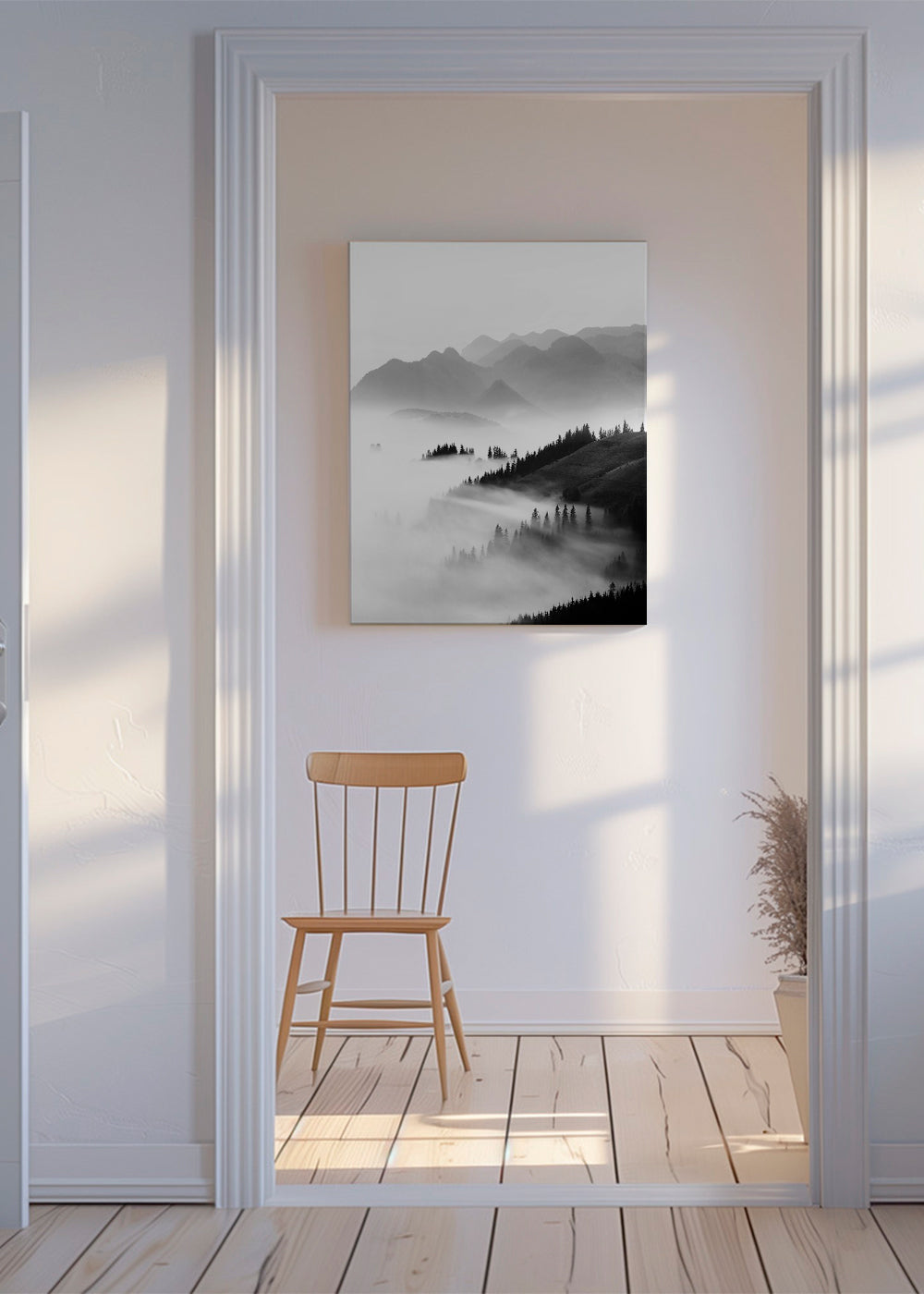 Bella opera ispirato alla collezione di quadri di paesaggi montani, ideata da Kathrin Pienaar, con colori monocromatico, e con posizione verticale. La tranquillità e il senso di libertà che trasmettono i quadri di paesaggi sono unici. Lascia che l'arte riempia la tua casa.