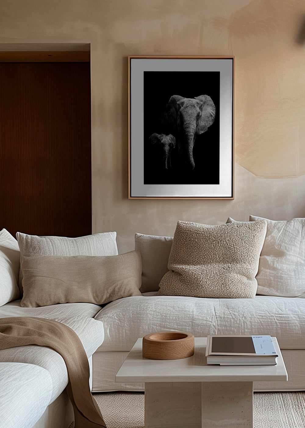 Una immagine appartenente alla categoria di quadri con elefante, di 1x, con sfumature dai colori monocromatico, e orientata in senso verticale. Le stampe di animali ci consentono di mostrare il nostro lato più selvaggio attraverso la decorazione delle pareti. Realizza un home decor ricco di arte. Quest'opera include un margine bianco che incornicia l'immagine e ne valorizza lo stile.