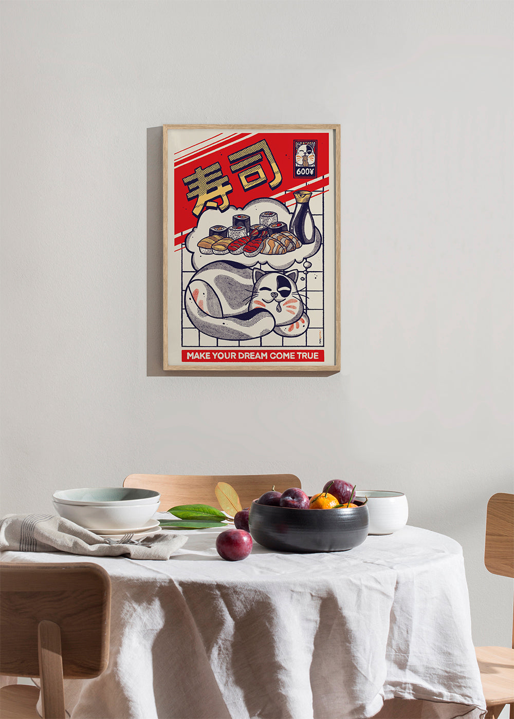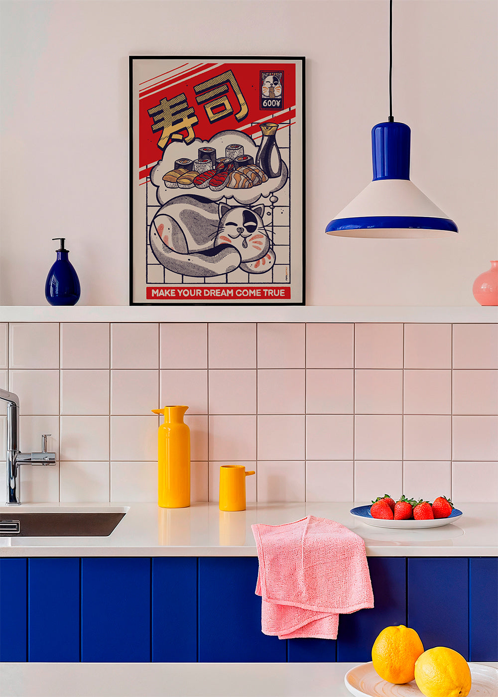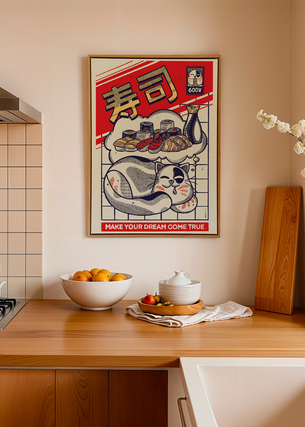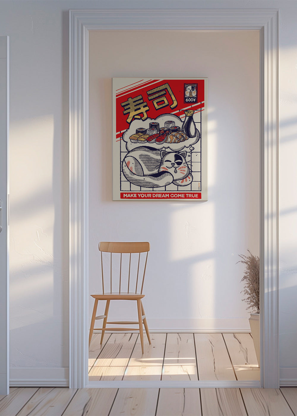 Una immagine della nostra collezione di quadri giapponesi, dell'artista Rafa Gomes, con dei tocchi rossi, e nel formato verticale. I quadri vintage donano un tocco incredibilmente chic a qualsiasi stanza. Una parete spoglia è priva di carattere, ma con qualche quadro le daremo personalità.