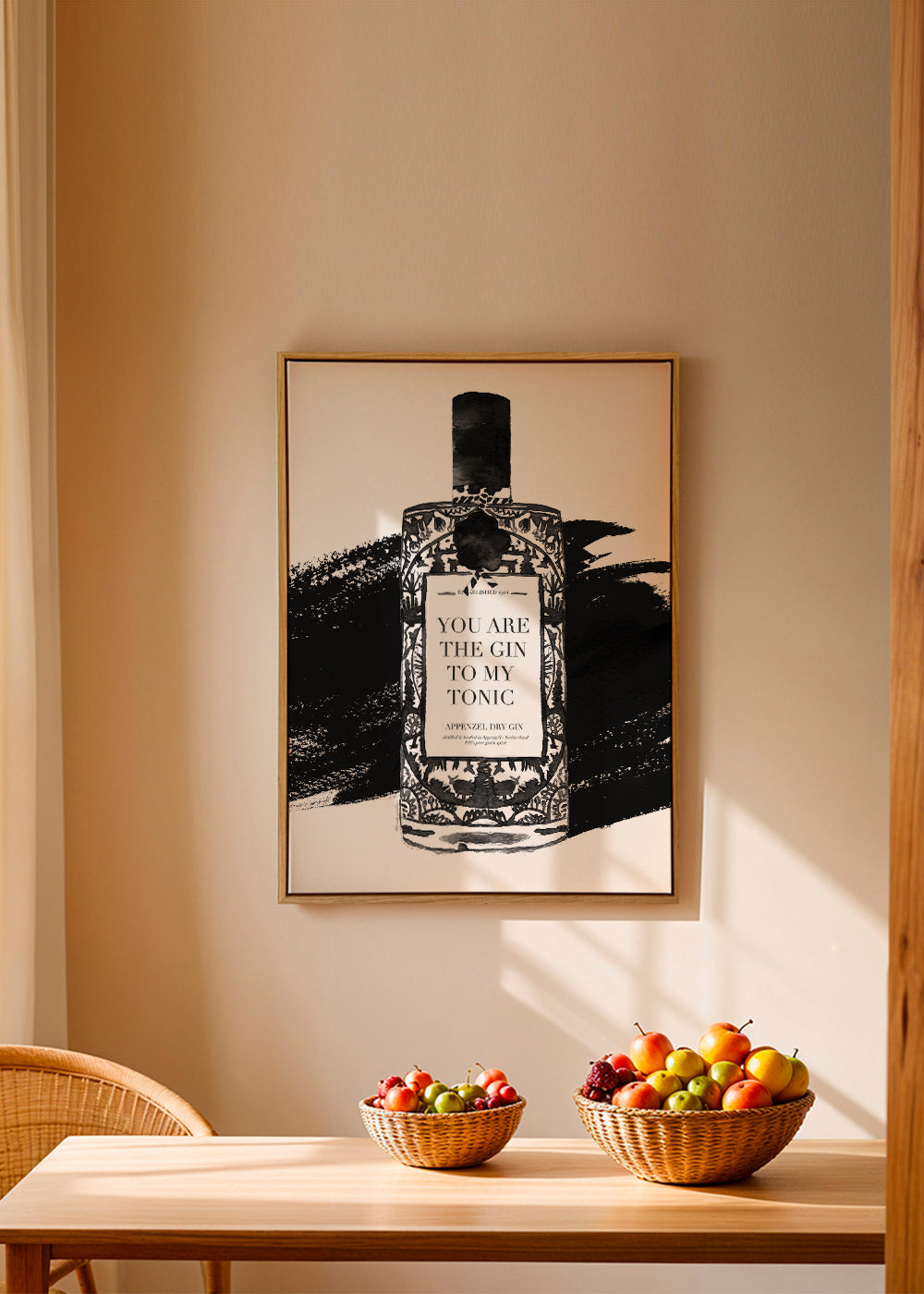 Un quadro dal nostro set di quadri con gin, della collezione dell'artista Mercedes Lopez Charro, con colori nero, e da formato verticale. Trasforma la tua cucina in un ambiente divertente grazie a questo e altri quadri per la cucina. Trasforma la tua casa in un luogo pieno di stile.