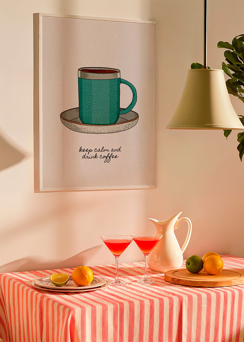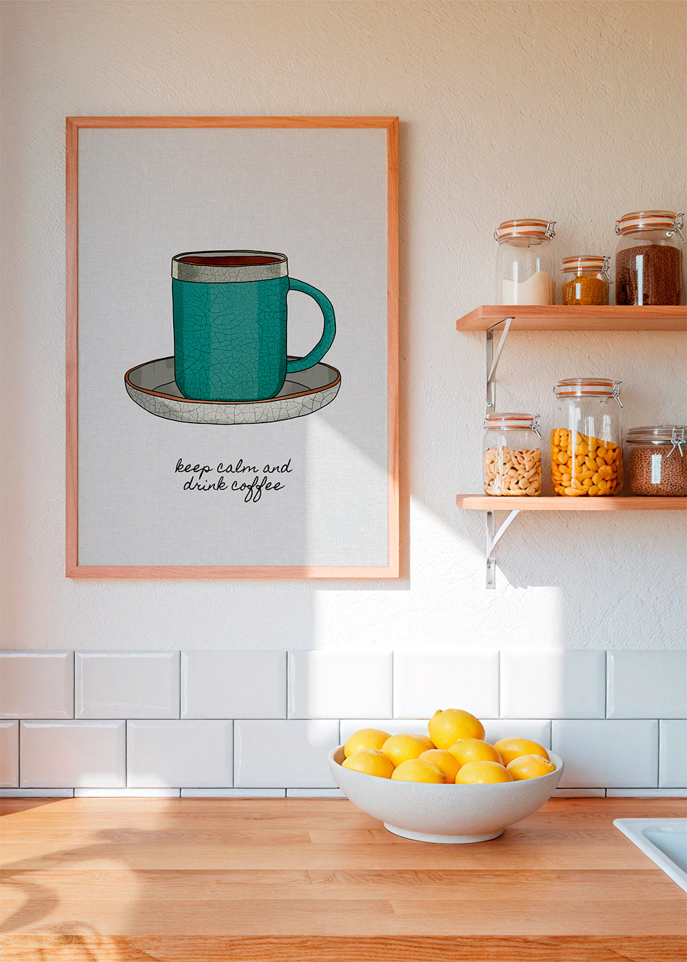 Bello quadro dal nostro repertorio di caffè nei quadri, di Orara Studio, con tonalità di colori verdi, e nel formato verticale. Trasforma la tua cucina in un ambiente divertente grazie a questo e altri quadri per la cucina. Riempi le tue pareti di opere artistiche.
