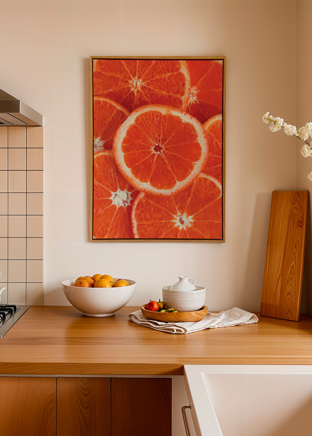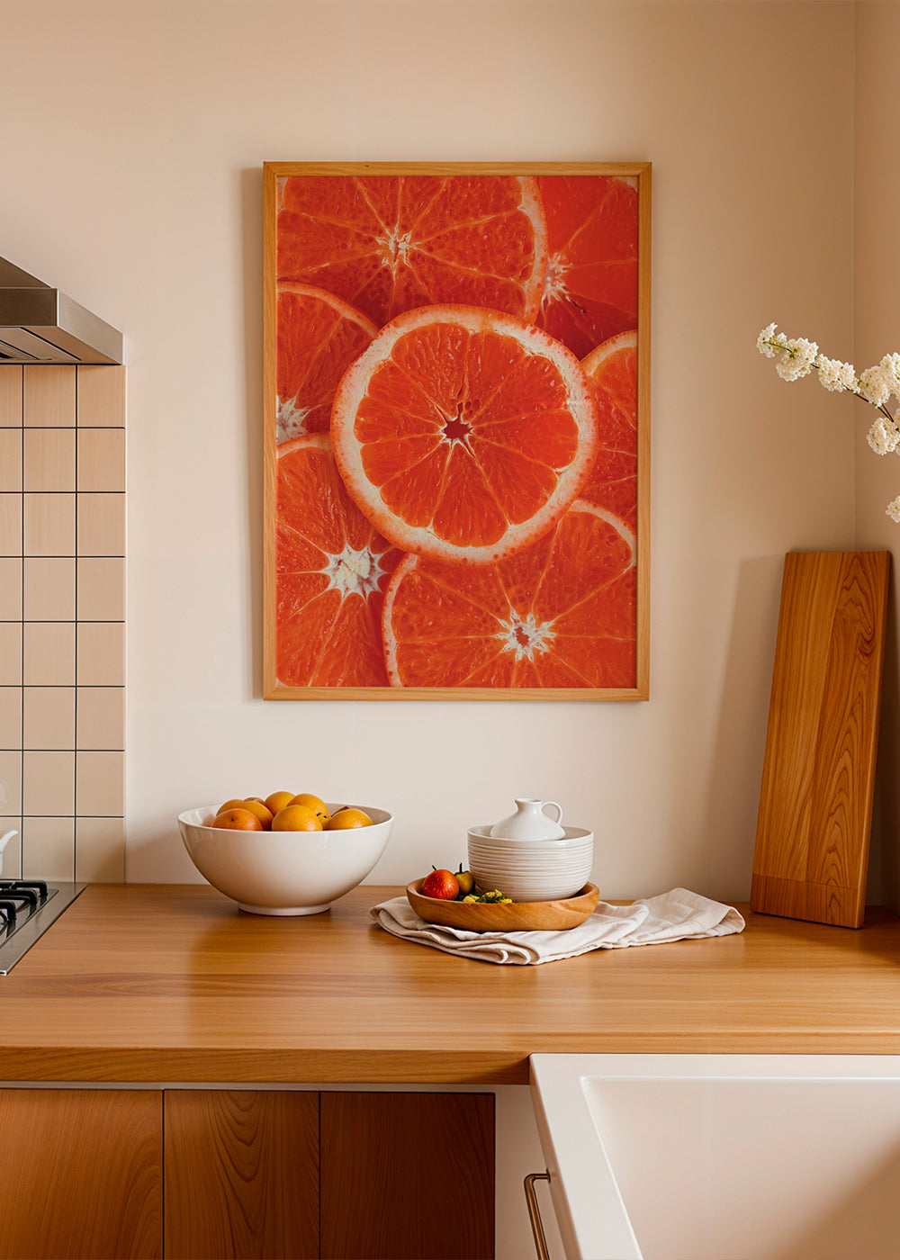 Bella stampa della collezione quadri con frutta, sui toni arance, e con posizione verticale. Trasforma la tua cucina in un ambiente divertente grazie a questo e altri quadri per la cucina. Dai personalità alle pareti della tua casa.
