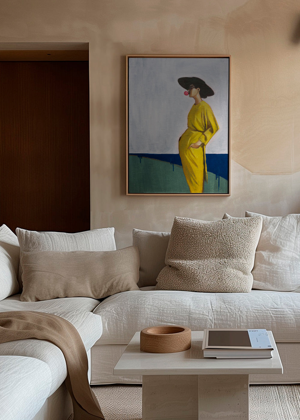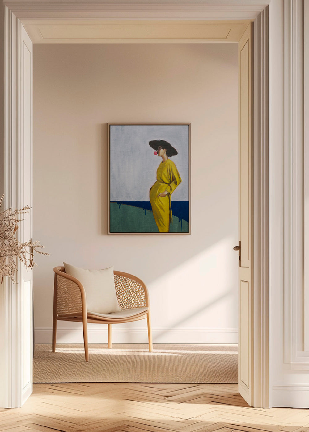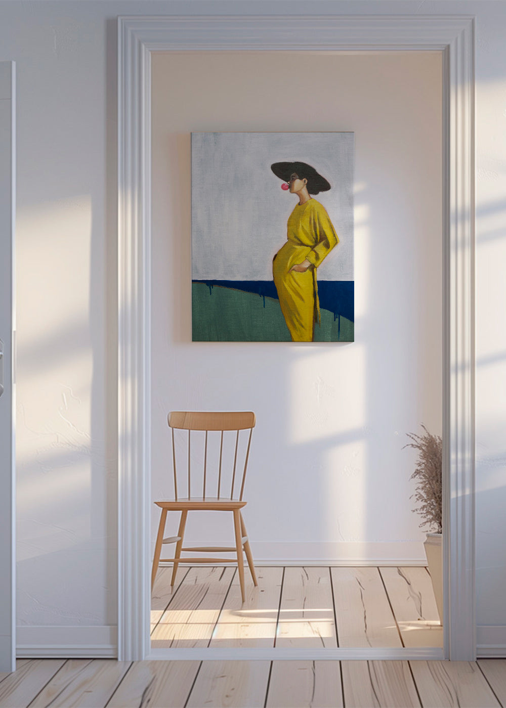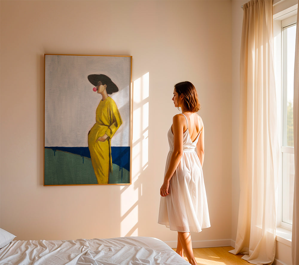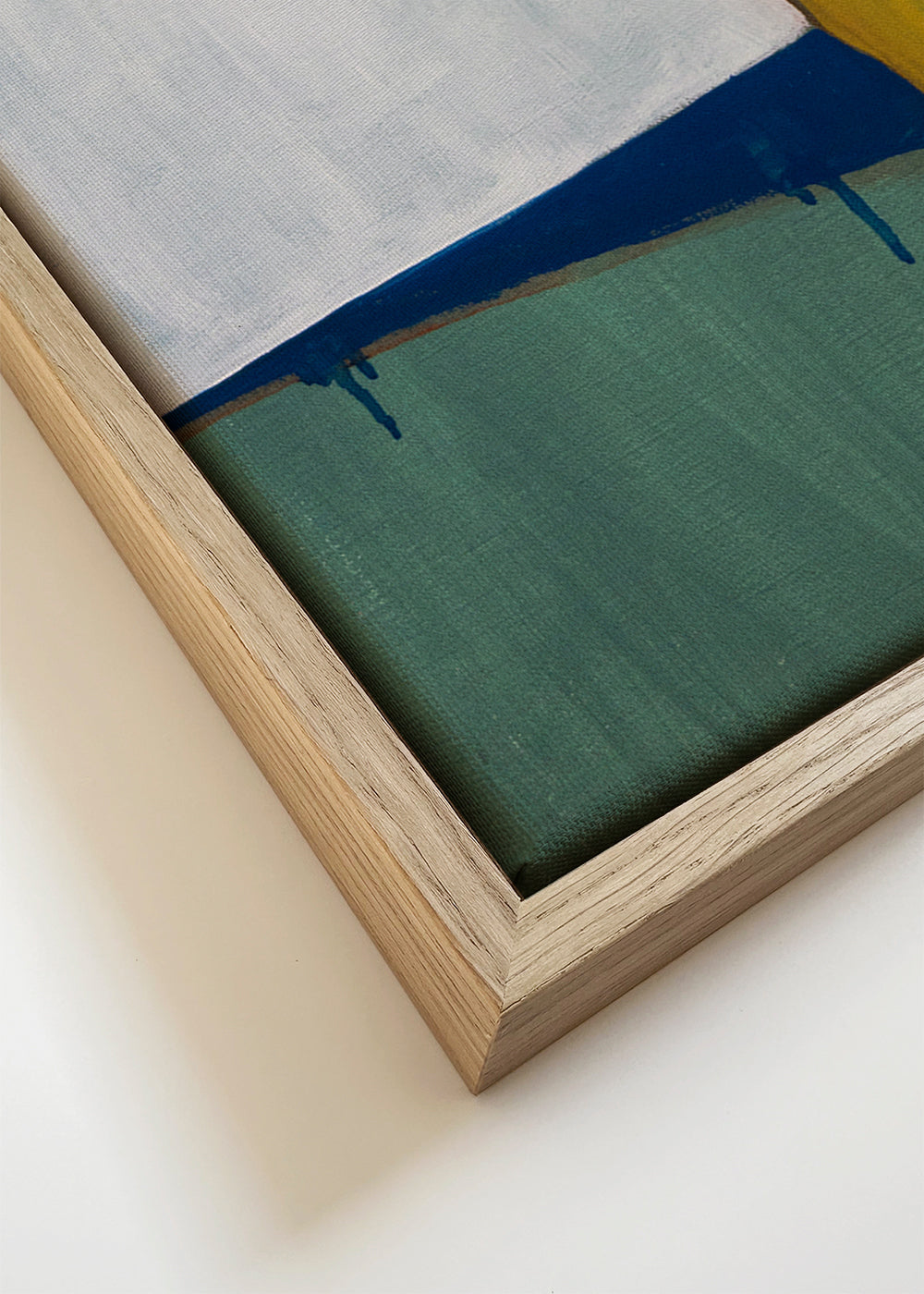 Ogni tela è tesa a mano su un telaio in legno. La profondità è di 3 cm per le tele senza cornice e di 4 cm per le tele incorniciate.