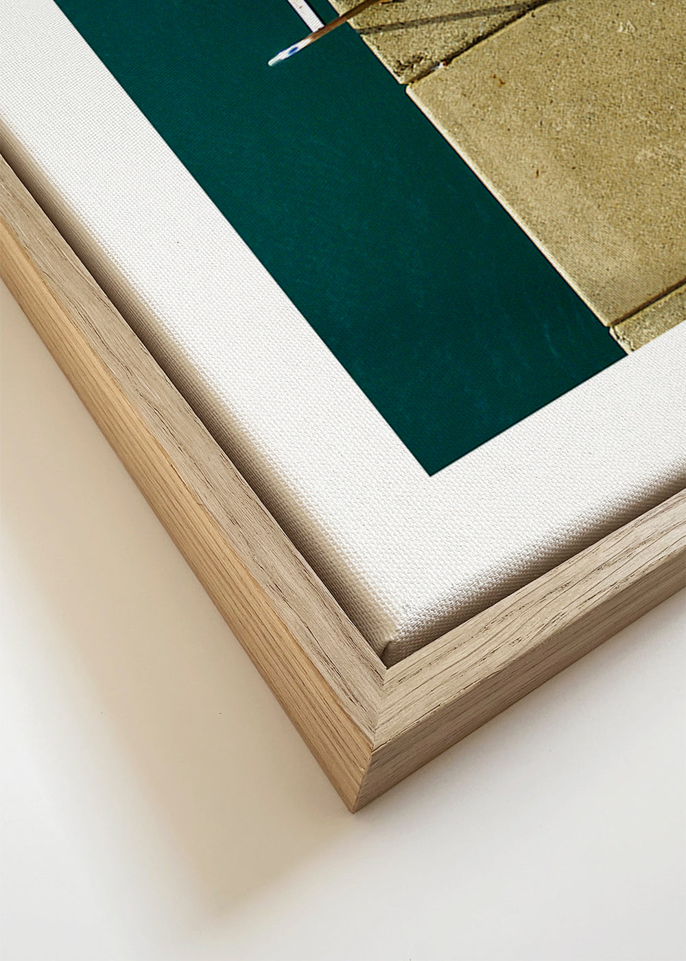 Per evitare rotture, le nostre cornici incorporano vetro acrilico al posto del vetro. Il vetro acrilico riproduce l'effetto del vetro, ma evita possibili danni durante il trasporto o il posizionamento della cornice.