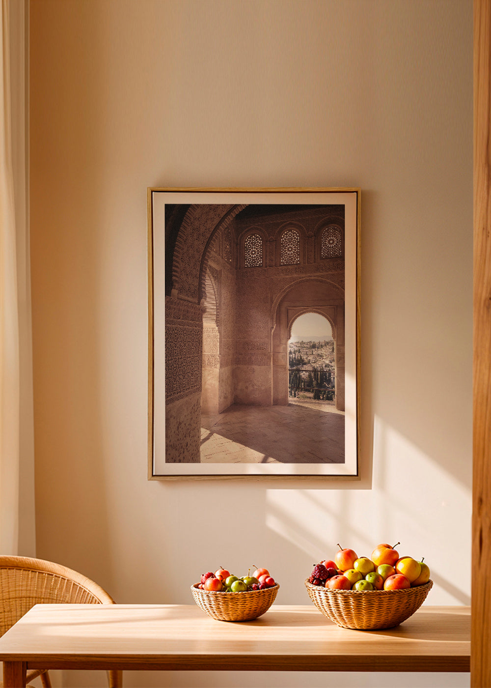 Se selezioni l'opzione passepartout, aggiungeremo la scatola di cartone bianca alla cornice e ridurremo il design dell'opera. Ad esempio, se selezioni un foglio di formato 50x70, con cornice e passepartout color rovere, ridurremo il disegno del foglio al formato precedente (40x50cm). In questo modo si adatterà perfettamente alla finestra interna del passepartout.