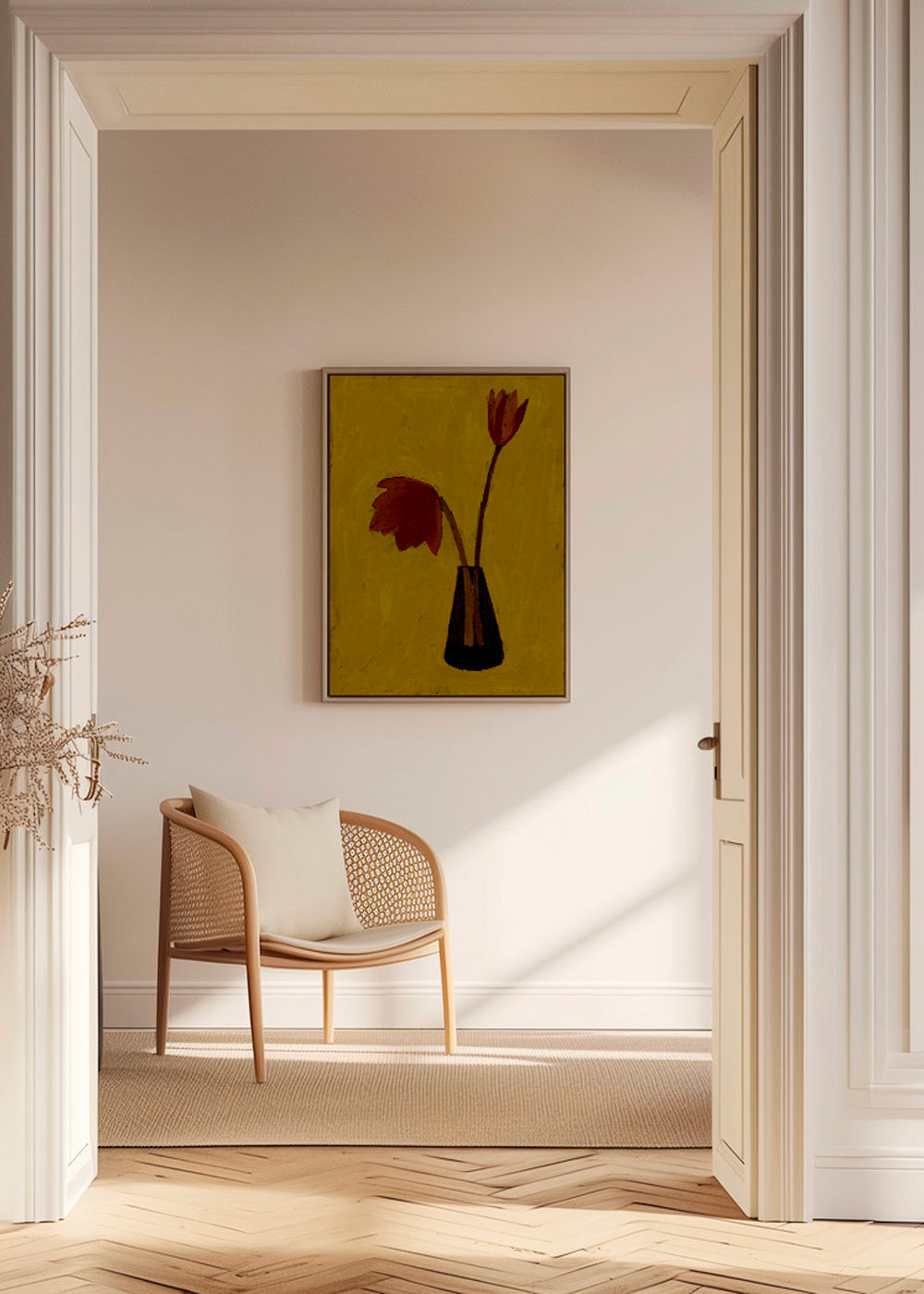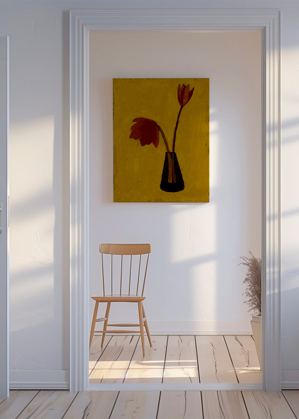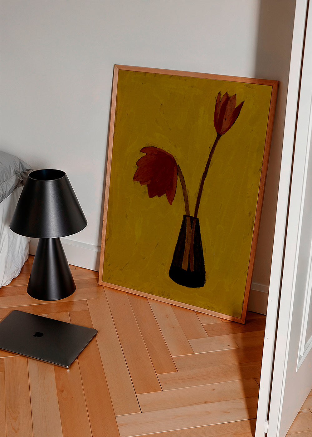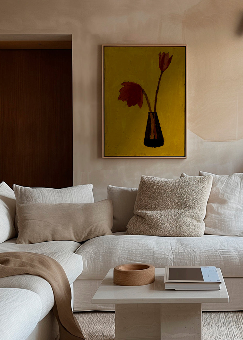 Un quadro della serie di quadri di fiori e piante, di Shatha Dafai, con colori gialli, e con posizione verticale. I quadri con illustrazioni sono perfetti da abbinare all'arte minimal e all'arte astratta. Una parete con dei quadri può trasformare completamente lo stile di una stanza.