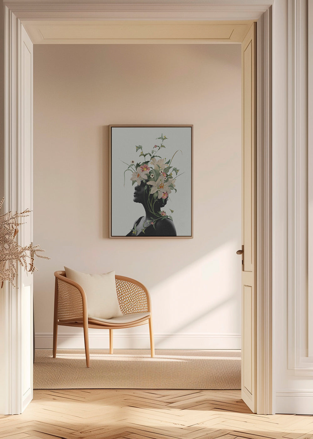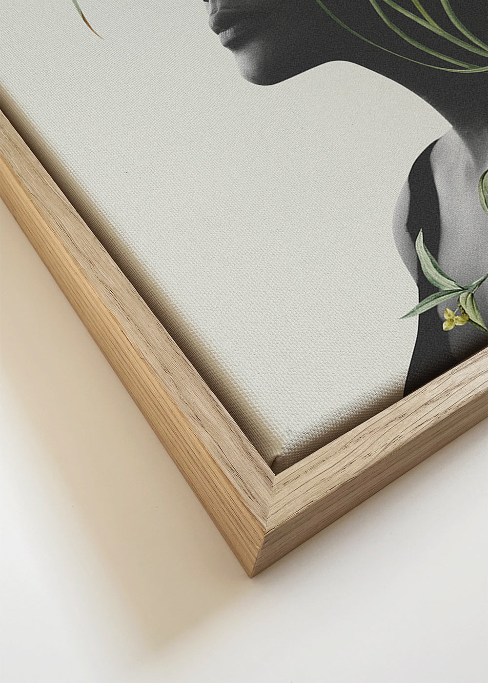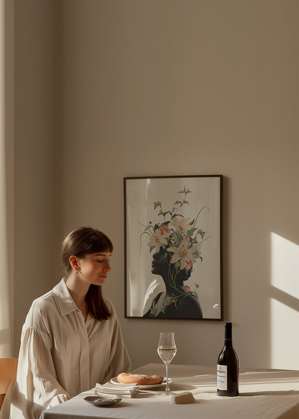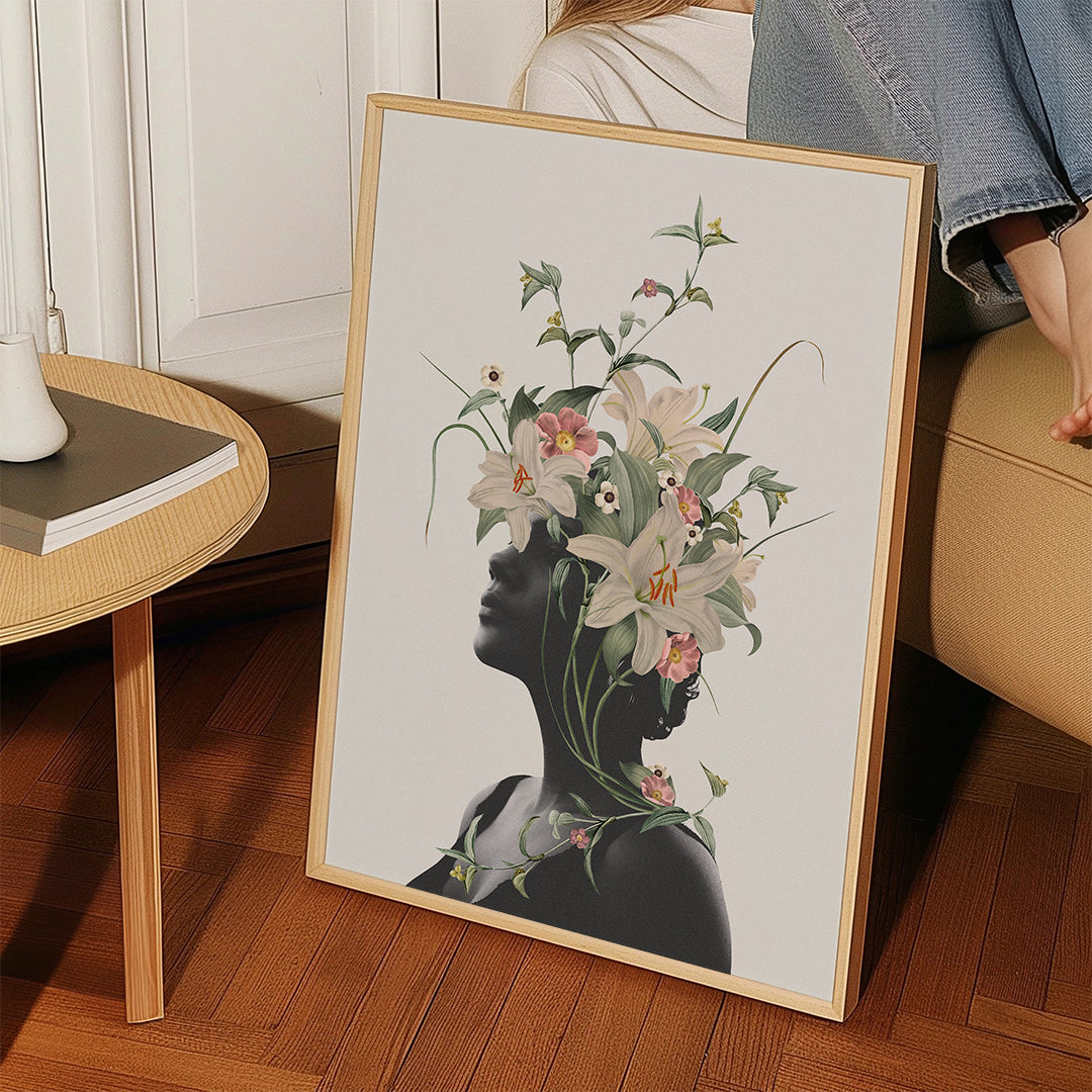 Un poster della serie di quadri femminili, originali di Frida Floral Studio, con pigmenti verdi e da posizionare verticalmente. Un'opera in stile retrò ideale per una decorazione con tocchi vintage. Cambia l'aspetto di una stanza solo aggiungendo quadri alle sue pareti.