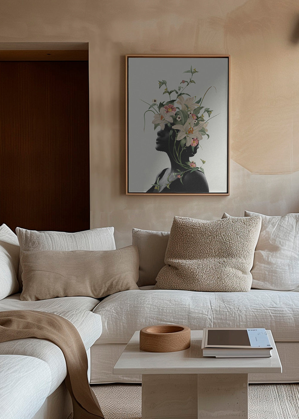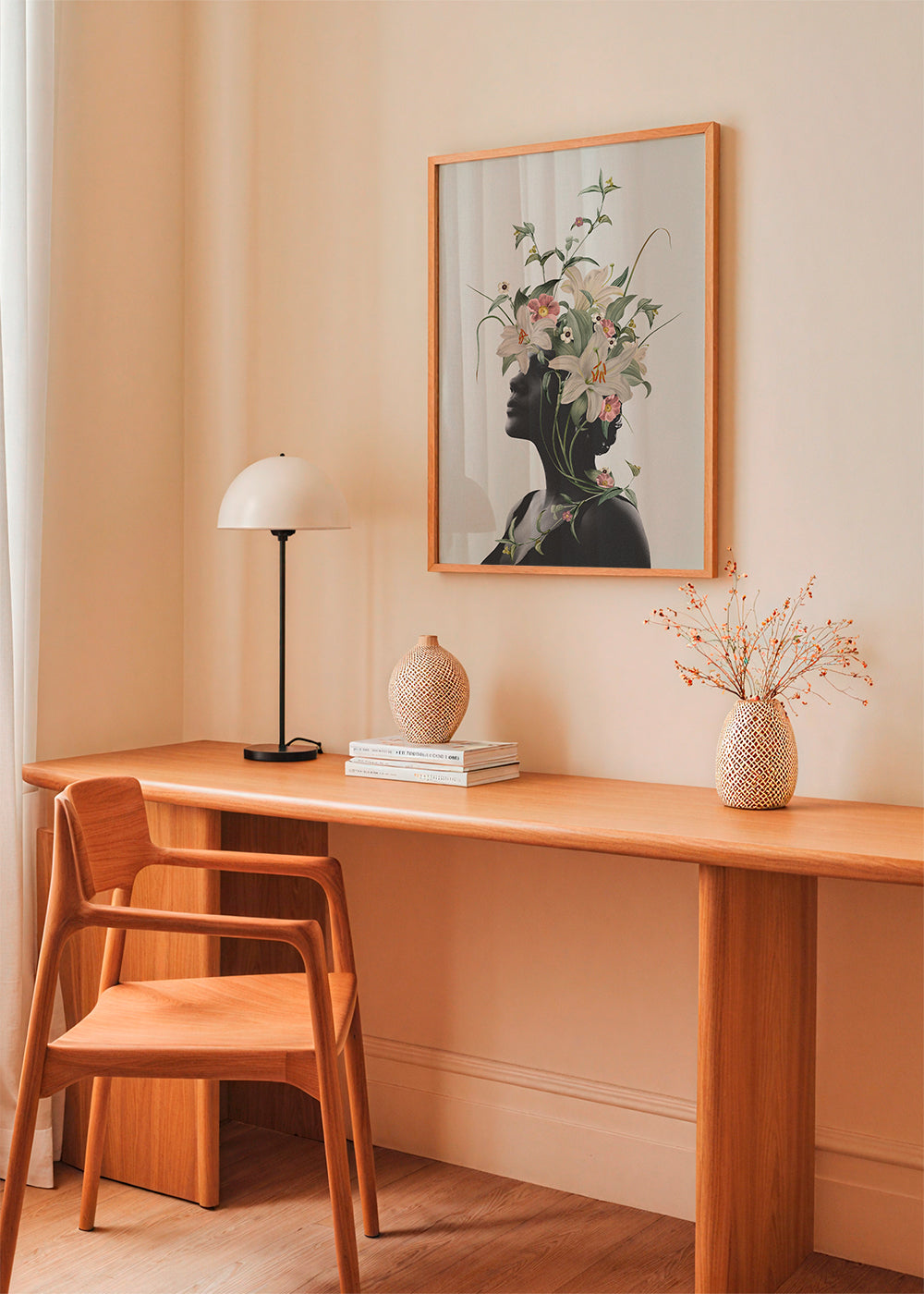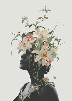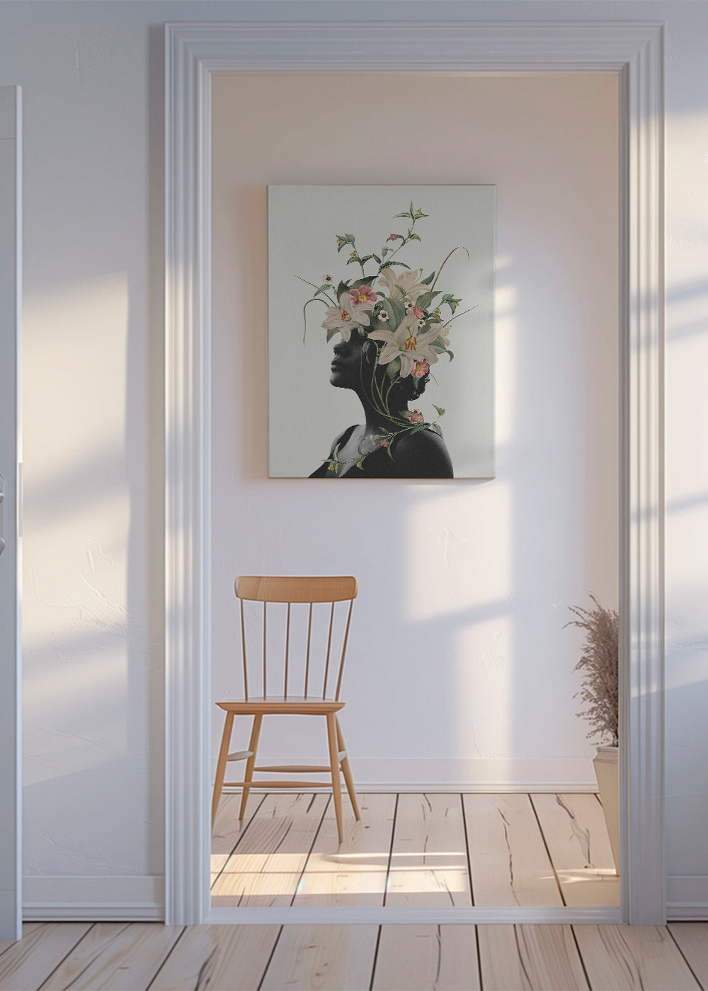 Un poster della serie di quadri femminili, originali di Frida Floral Studio, con pigmenti verdi e da posizionare verticalmente. Un'opera in stile retrò ideale per una decorazione con tocchi vintage. Cambia l'aspetto di una stanza solo aggiungendo quadri alle sue pareti.