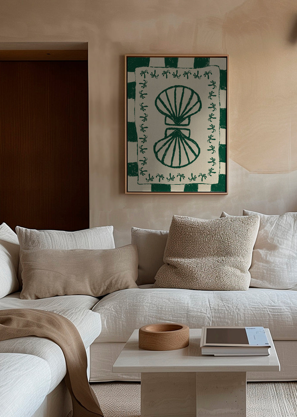 Una stampa ispirato alla collezione di quadri con mare, di Shatha Dafai, con sfumature dai toni verdi, e con orientamento verticale. I quadri con illustrazioni sono perfetti da abbinare all'arte minimal e all'arte astratta. Una parete spoglia è come una tela bianca da dipingere.