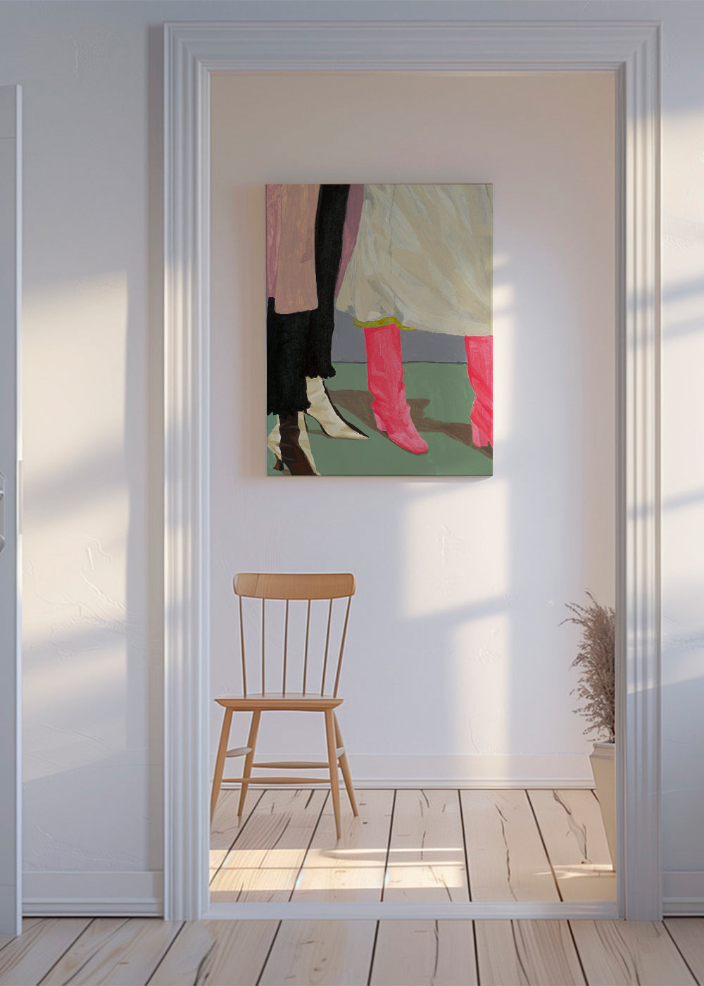 Ogni tela è tesa a mano su un telaio in legno. La profondità è di 3 cm per le tele senza cornice e di 4 cm per le tele incorniciate.