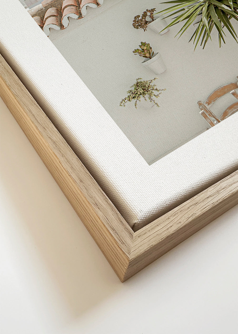 Se selezioni l'opzione passepartout, aggiungeremo la scatola di cartone bianca alla cornice e ridurremo il design dell'opera. Ad esempio, se selezioni un foglio di formato 50x70, con cornice e passepartout color rovere, ridurremo il disegno del foglio al formato precedente (40x50cm). In questo modo si adatterà perfettamente alla finestra interna del passepartout.