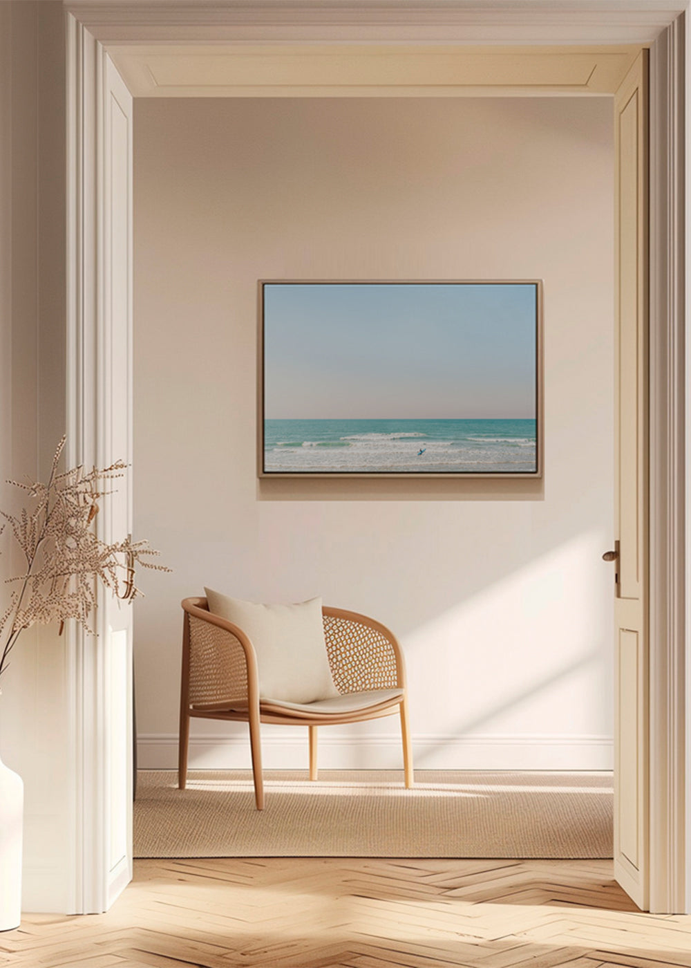 Questo design della nostra collezione di quadri di spiagge e coste, della collezione dell'artista Cordula Schaefer, con dei tocchi blu, e da mettere in posizione orizzontale. La tranquillità e il senso di libertà che trasmettono i quadri di paesaggi sono unici. Arte e design allo stato puro.
