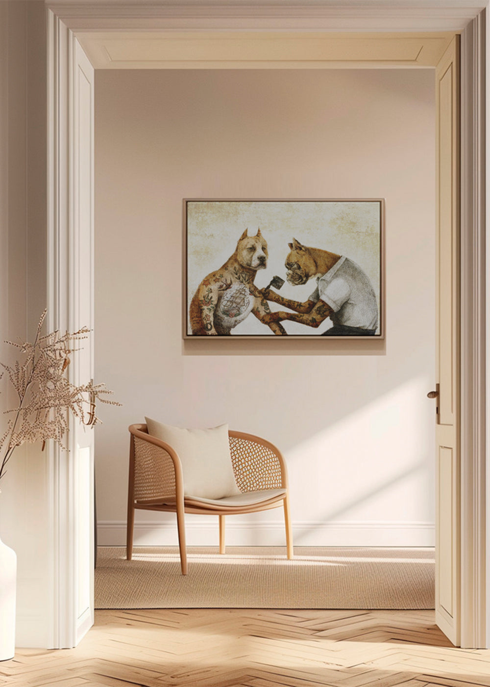 Per evitare rotture, le nostre cornici incorporano vetro acrilico al posto del vetro. Il vetro acrilico riproduce l'effetto del vetro, ma evita possibili danni durante il trasporto o il posizionamento della cornice.