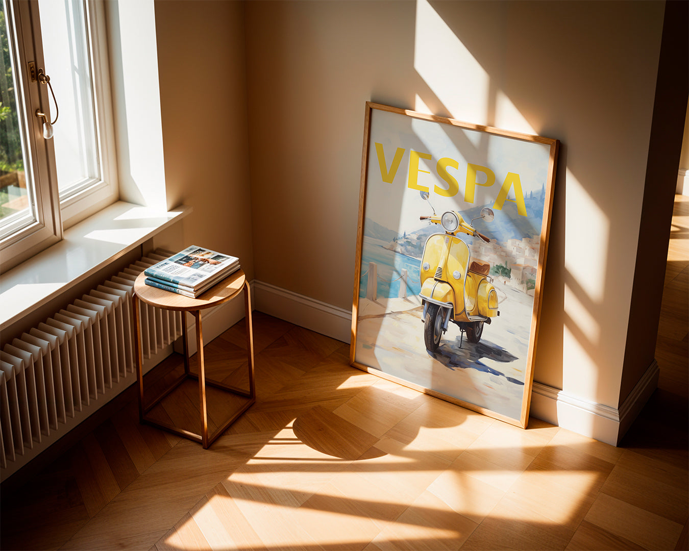 Bello poster ispirato alla collezione di quadri con motociclette, dell'artista Seven Wall Art, dalle sfumature gialli, e nel formato verticale. I quadri minimal sono ideali per uno stile decorativo moderno ed elegante. Pareti traboccanti di creatività.