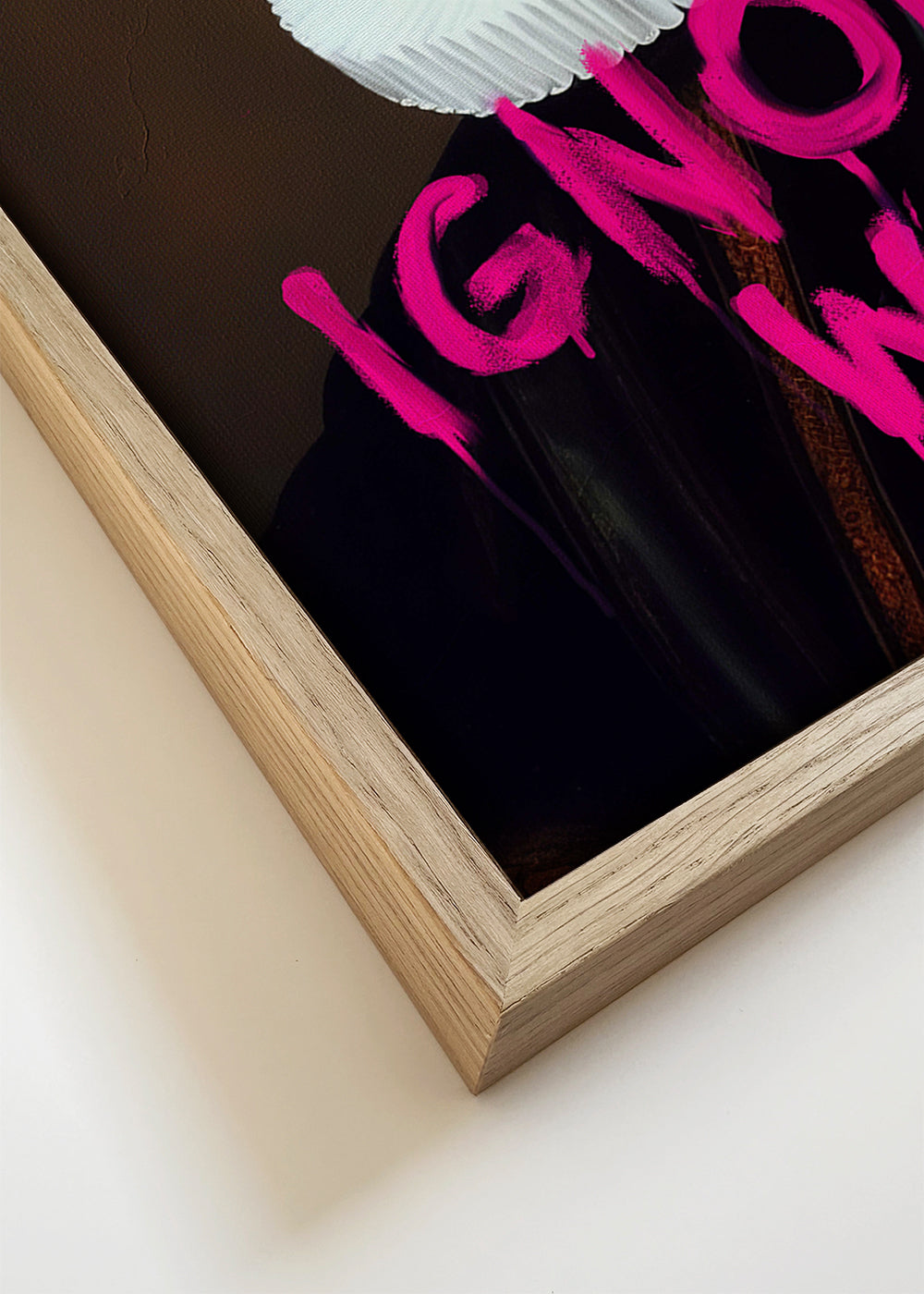 Per evitare rotture, le nostre cornici incorporano vetro acrilico al posto del vetro. Il vetro acrilico riproduce l'effetto del vetro, ma evita possibili danni durante il trasporto o il posizionamento della cornice.